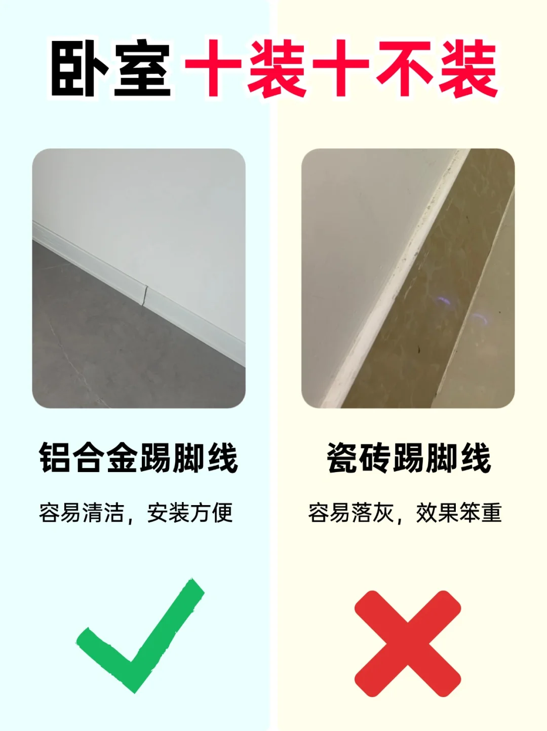 ⭕️不装瓷砖踢脚线,容易落灰。效果笨重