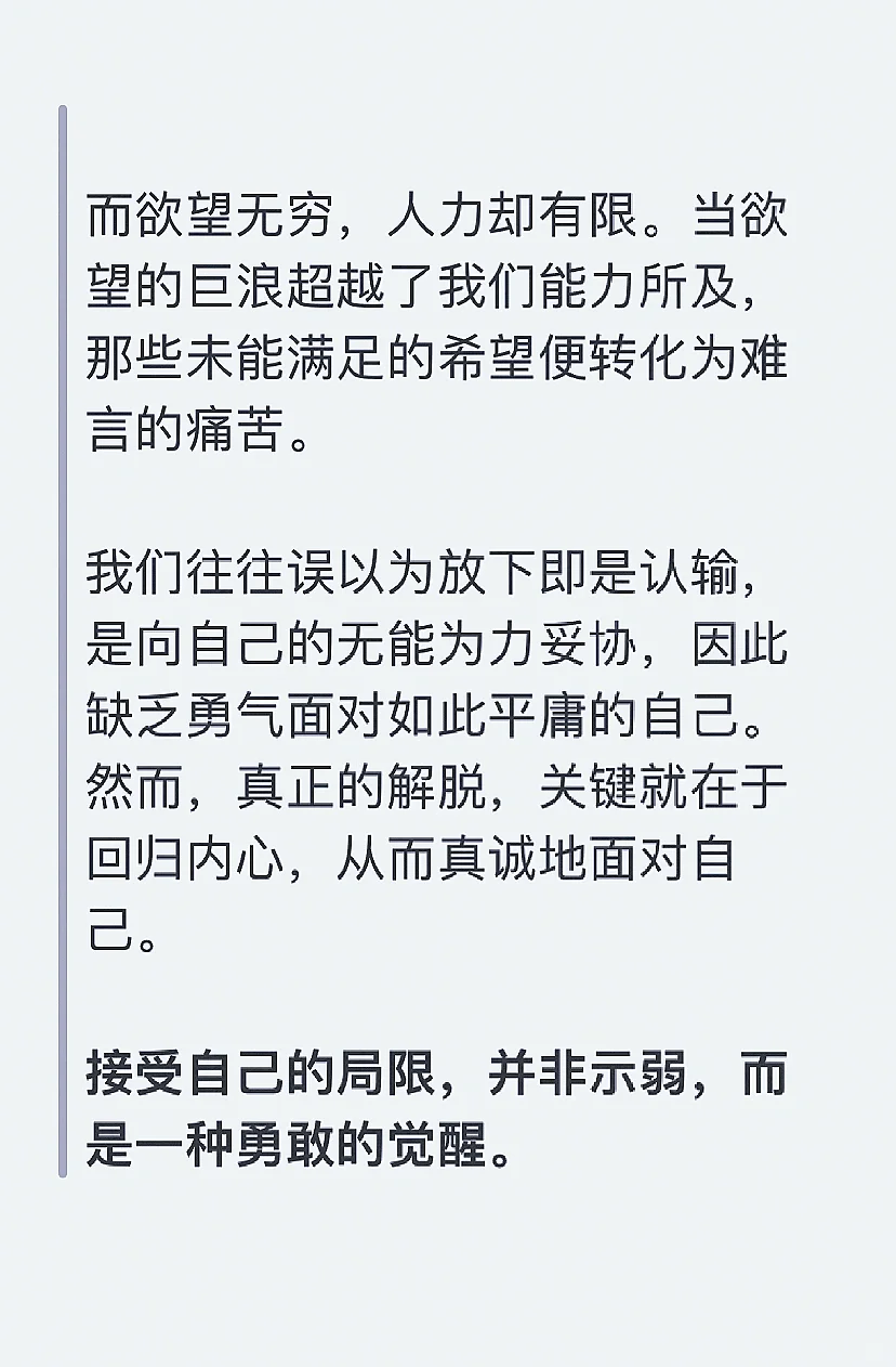 让你痛苦的,恰恰正是自己,与他人无关。 正如《今日简史》中所说:各种痛苦最深层的来源,就在于自己的心智。 大千世界,万种诱惑,我们深处其中,欲望便如同潮水一般,一波未平,一波又起。它们汹涌澎湃,似乎永无止境。 而欲望无穷,人力却有限。当欲望的巨浪超越了我们能力所及,那些未能满足的希望便转化为难言的痛苦。 我们往往误以为放下即是认输,是向自己的无能为力妥协,因此缺乏勇气面对如此平庸的自己。 然而,真正的解脱,关键就在于回归内心,从而真诚地面对自己。 接受自己的局限,并非示弱,而是一种勇敢的觉醒。