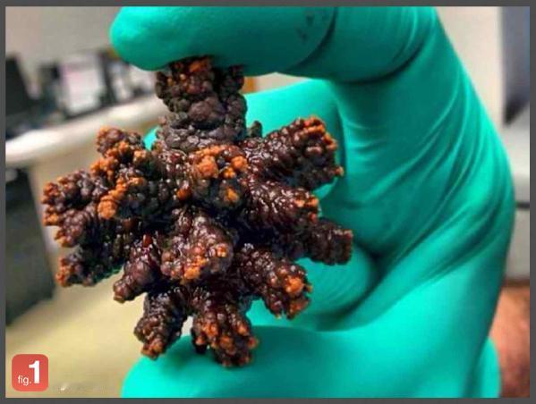 国外网友晒出了自己体内取出的肾结石,发现长得非常像新冠病毒,看着就觉得疼…(图1-2) 这种结石又被称为Jack石(Jackstone)(图3-4),但最常见的部位是膀胱,很少发生在上尿路。 #你知道吗#