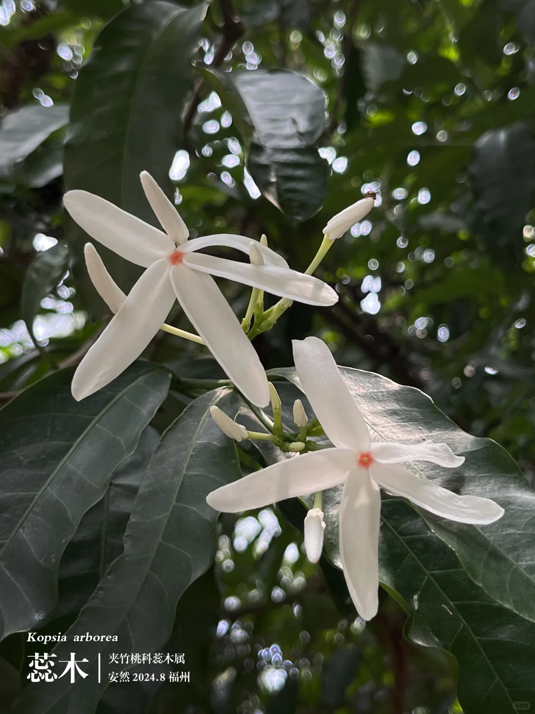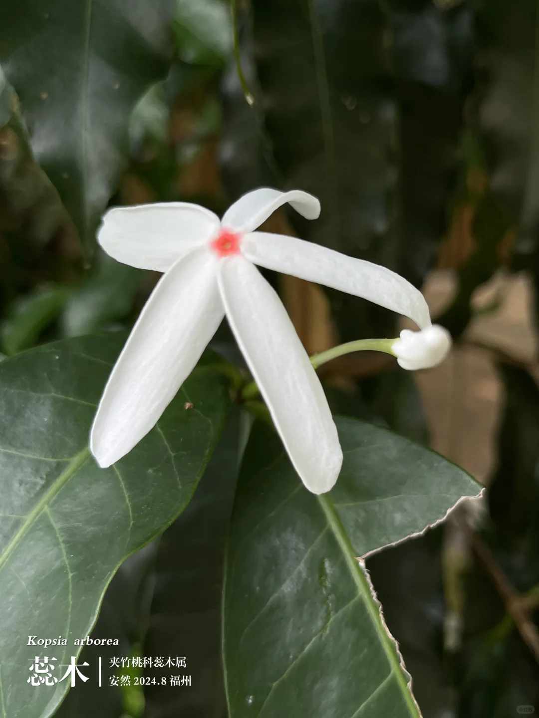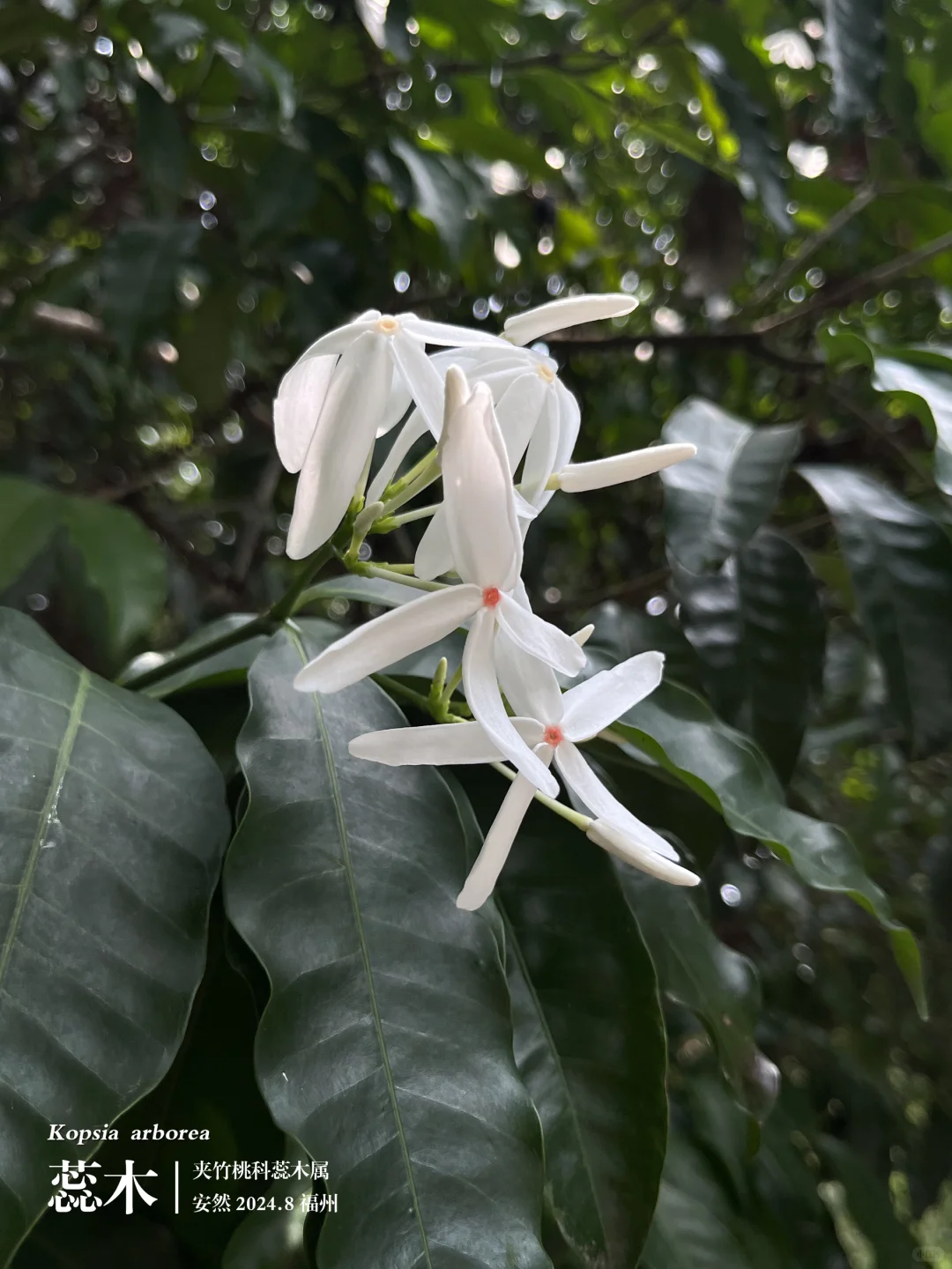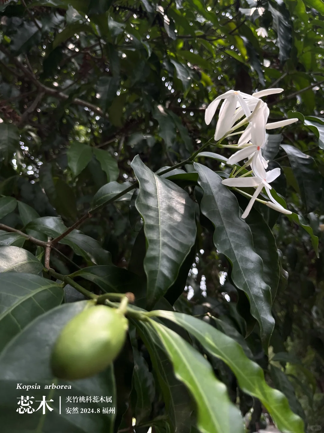 蕊木是夹竹桃科蕊木属的常绿乔木,植物志称其为云南蕊木,福州森林公园也遵从该说法(具体信息详见我的笔记:福州植物打标123)。 蕊木花瓣洁白修长,造型独特,花心还有一点红,娇羞可爱,颇为养眼。 狭长的革质叶子别致,边缘还有波浪状的起伏,明明是大山里的植物,却有着海洋的浪漫。 蕊木属于间花间果的品种。果实有点像橄榄的果实。故而它有个俗名是“假乌榄树”。