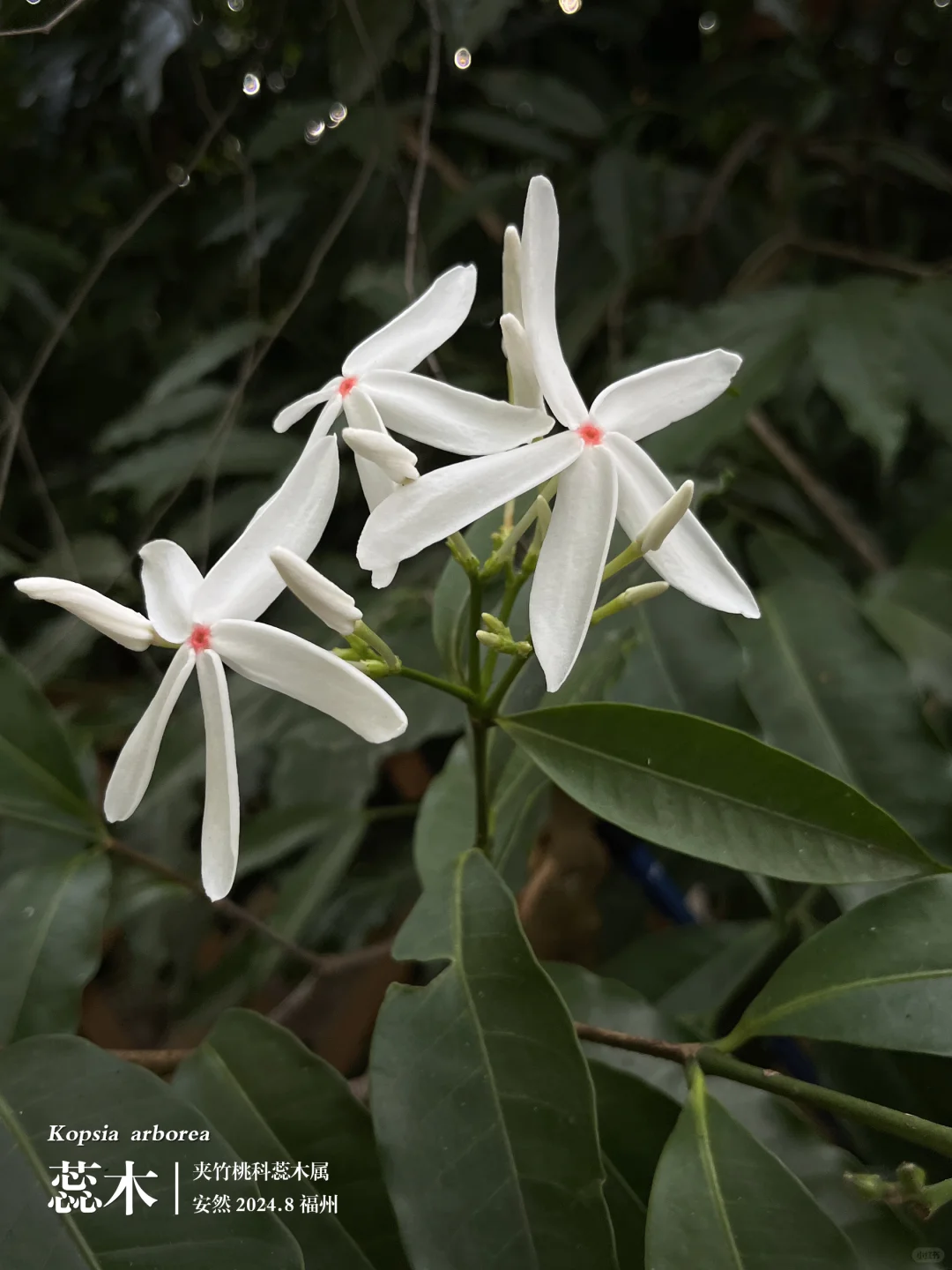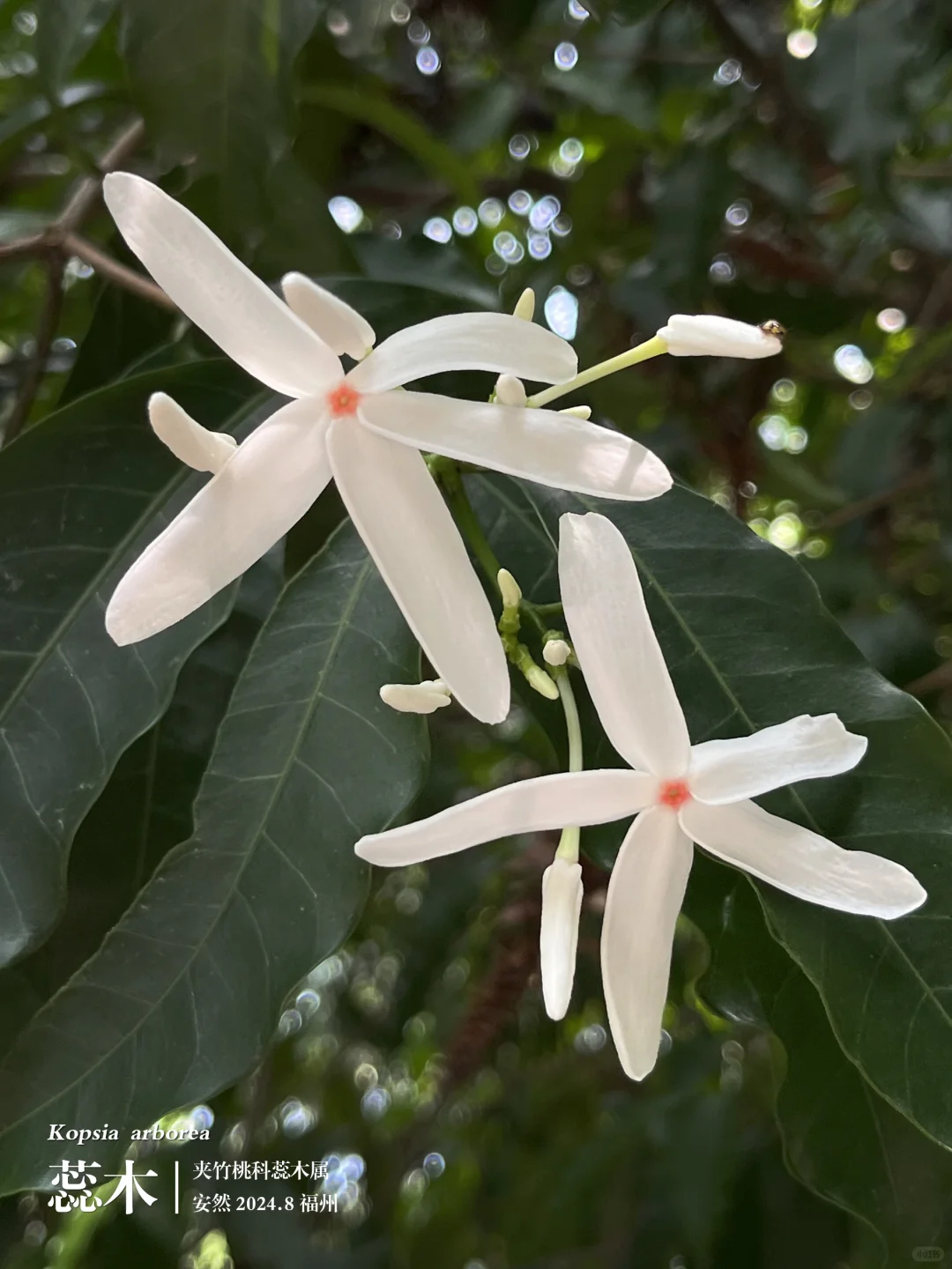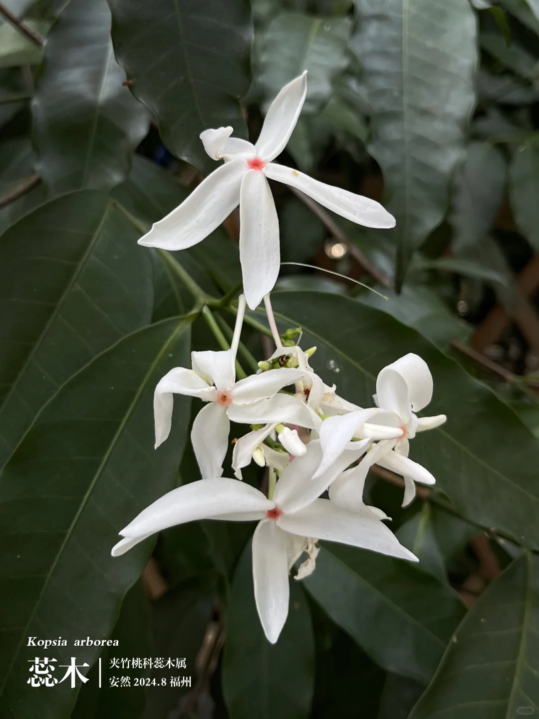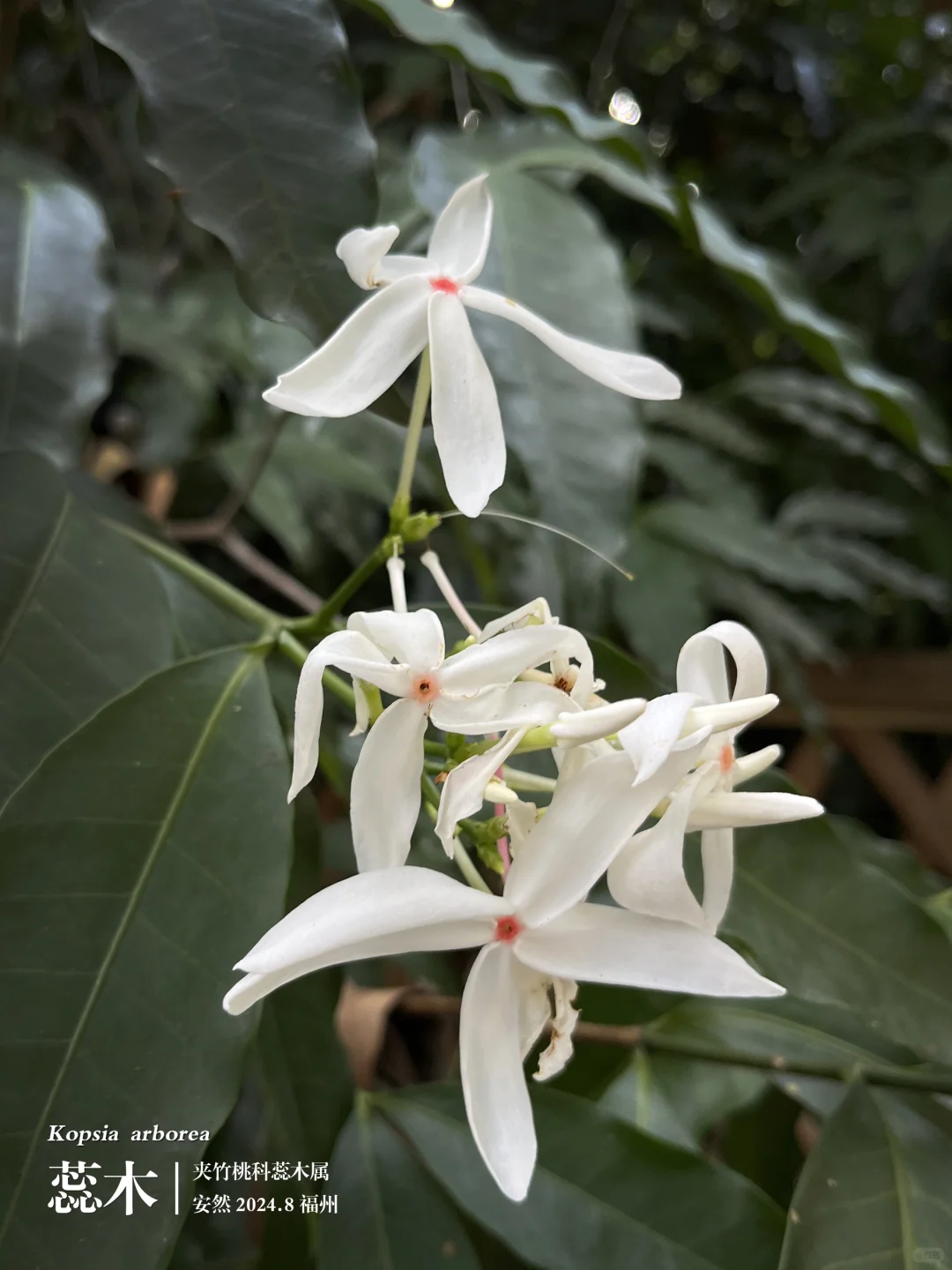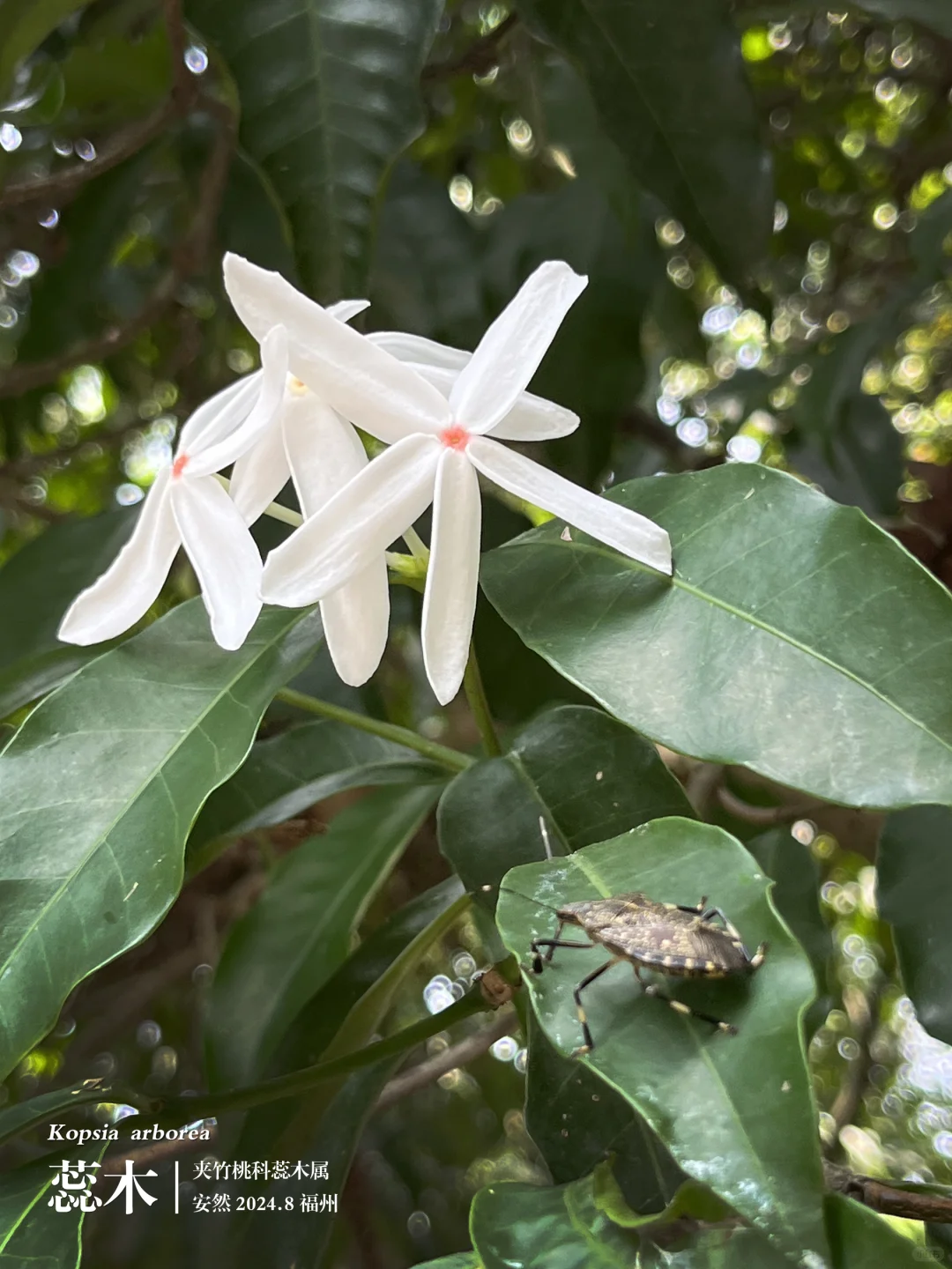 蕊木是夹竹桃科蕊木属的常绿乔木,植物志称其为云南蕊木,福州森林公园也遵从该说法(具体信息详见我的笔记:福州植物打标123)。 蕊木花瓣洁白修长,造型独特,花心还有一点红,娇羞可爱,颇为养眼。 狭长的革质叶子别致,边缘还有波浪状的起伏,明明是大山里的植物,却有着海洋的浪漫。 蕊木属于间花间果的品种。果实有点像橄榄的果实。故而它有个俗名是“假乌榄树”。