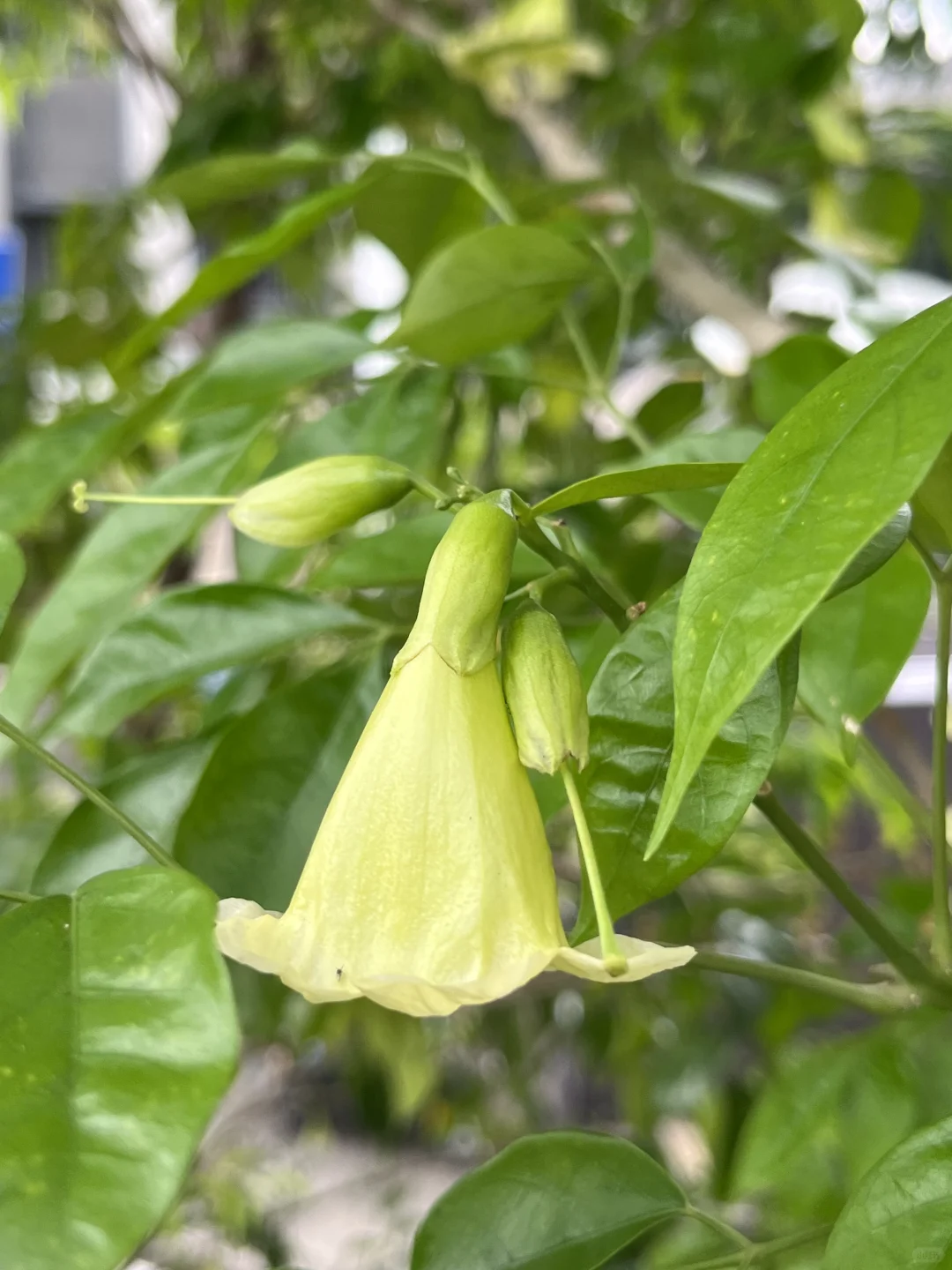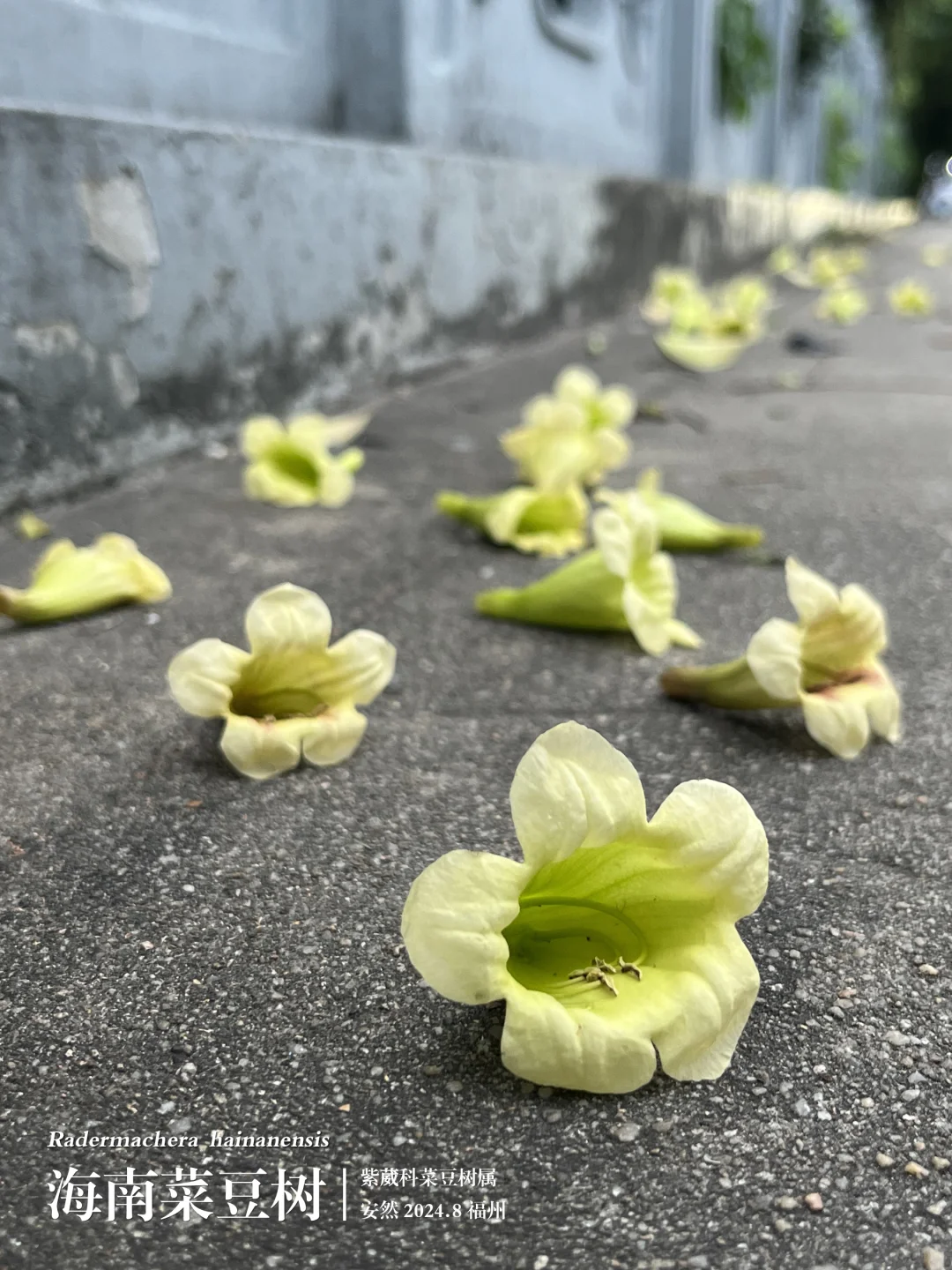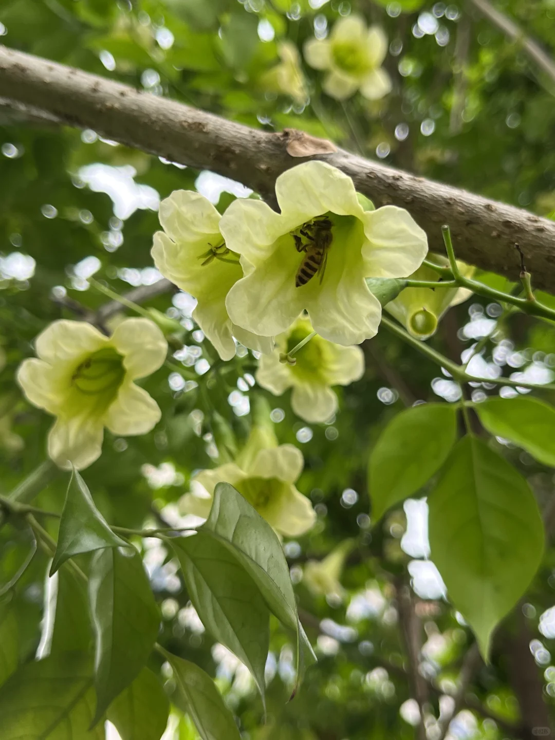 它的花冠钟形五裂,花整体呈黄绿色,在枝叶茂密的树上并不显眼,每次都是看到落花,才注意到。