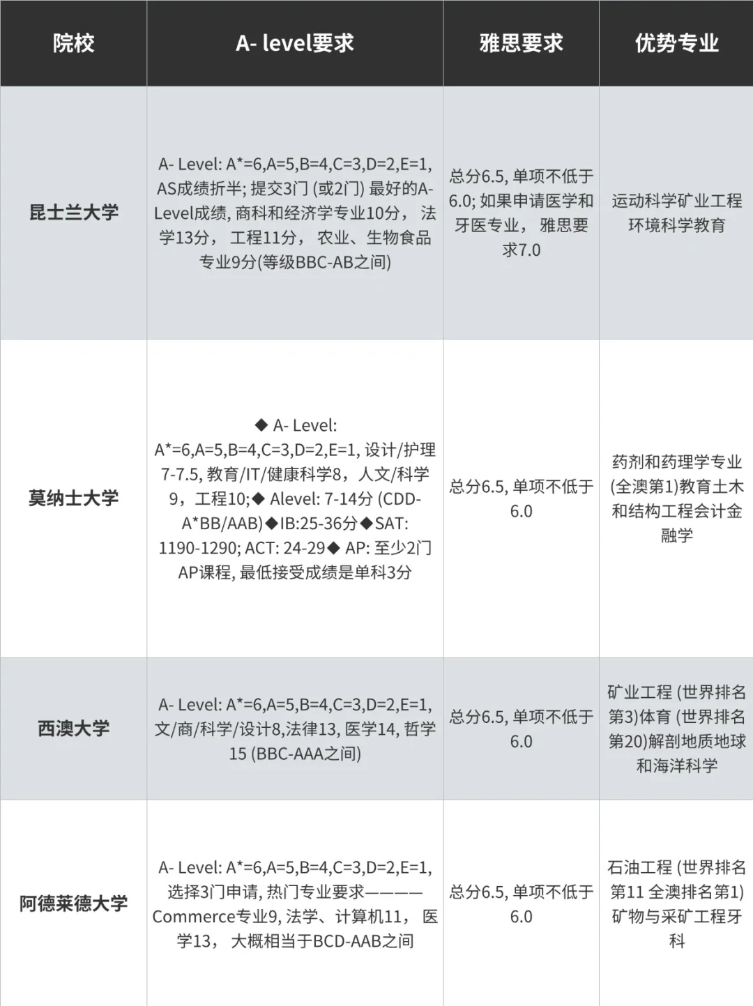 下面给大家讲讲澳洲八大的 A-level 要求和雅思要求😎: