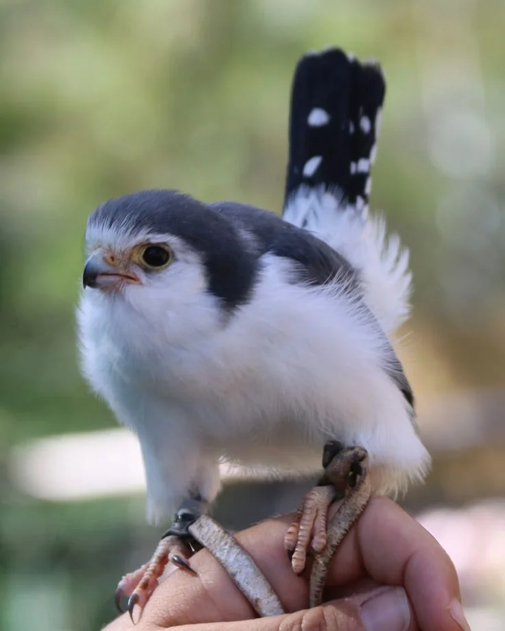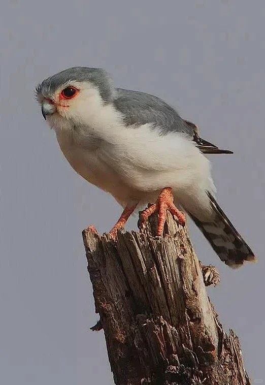 🍀形态特征:非洲侏隼体长18-20厘米,翼展37-40厘米,体重59-64克。这种小型猛禽的大小和外观与伯劳鸟相似,具有短而尖的翅膀,其尖端几乎到达尾巴的中部。该物种具有圆形边缘。成年雄性呈现灰蓝色的上体、脸颊白色、薄领(通常部分隐藏)和白色的臀部。黑色的羽毛管染上了白色。次级飞羽和尾巴的边缘是白色的,整个下体也是白色的。蜡膜和裸腿呈橙红色。喙为黑色,底部为浅灰色。虹膜深棕色的,有深橙色的眼环。