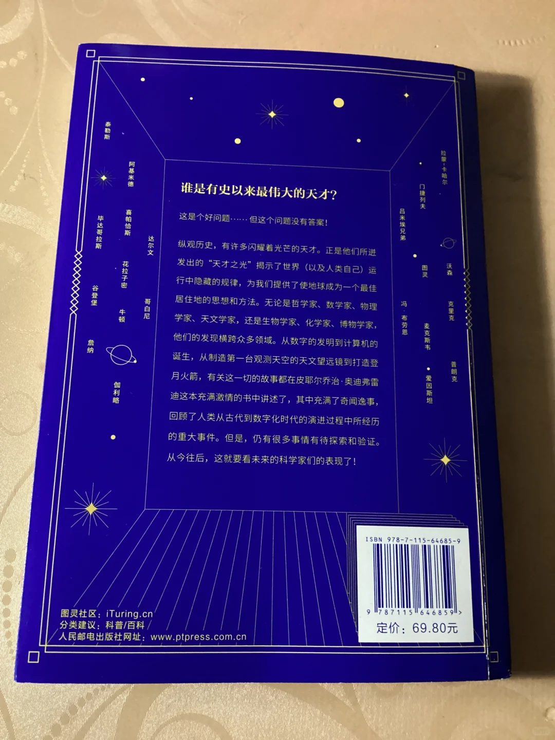 [萌萌哒R]再探讨一下这本书的人物选择。在人类社会和智力发展的历史上,有了这些天才思考者的出现,才有改变了人类社会各领域的动力。从神学,到哲学,再到科学,人对自然的观察和探索是逐步出成果的。作者的选择是从古希腊名人开始的,从代表着自然规律永恒不变的数学开始,穿插了天文观测学、金属活字印刷术、物理世界的若干次里程碑事件、直到生物免疫学、化学和计算机科学、航空航天学的应用。不能说很全面,但基本涵盖了各时期重大科学事件的关键人物。