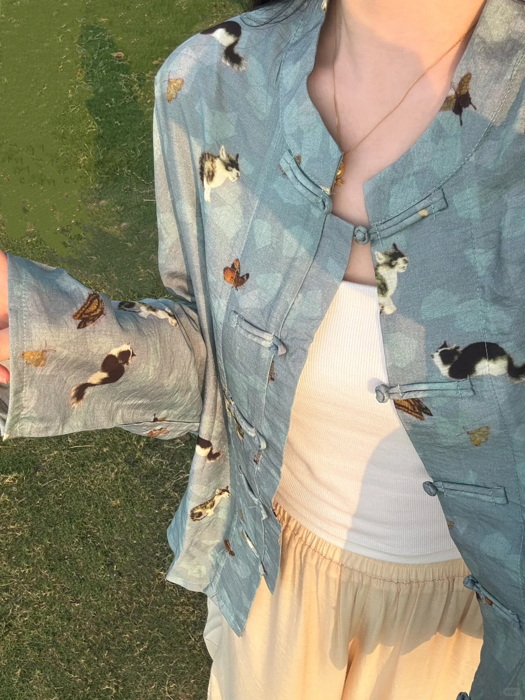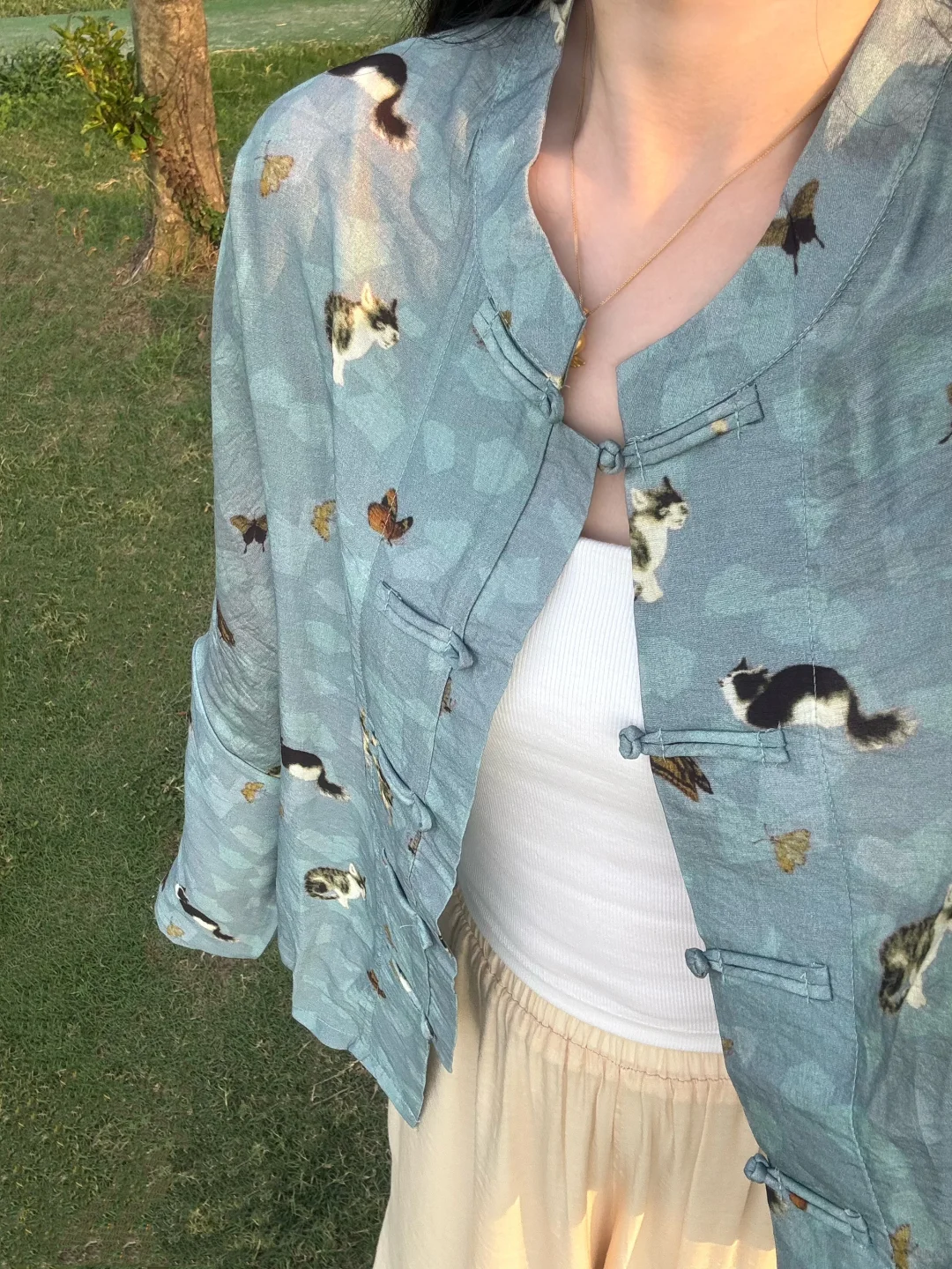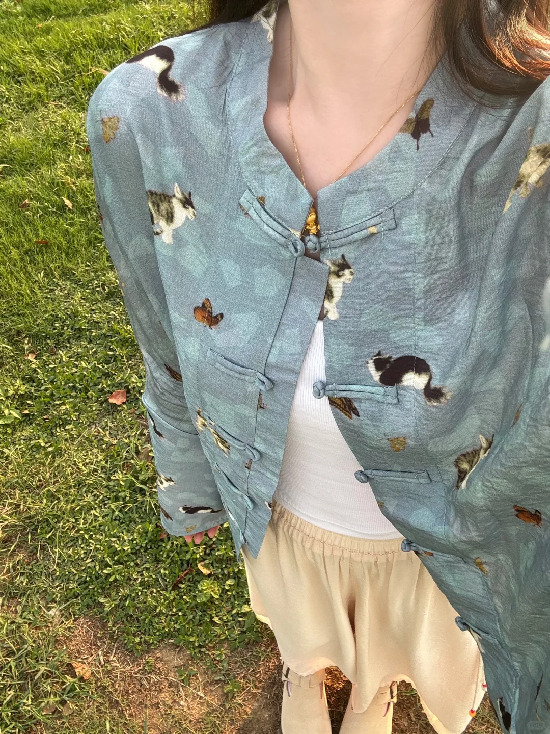 一眼艺术生 文艺调性 小茶服盘扣衬衫 温柔的少女感 蓝色系也太太太显白啦 快快交出你们的猫咪照片~[派对R] 裤子搭配参考:仙女裤-搭米色或白色都好看