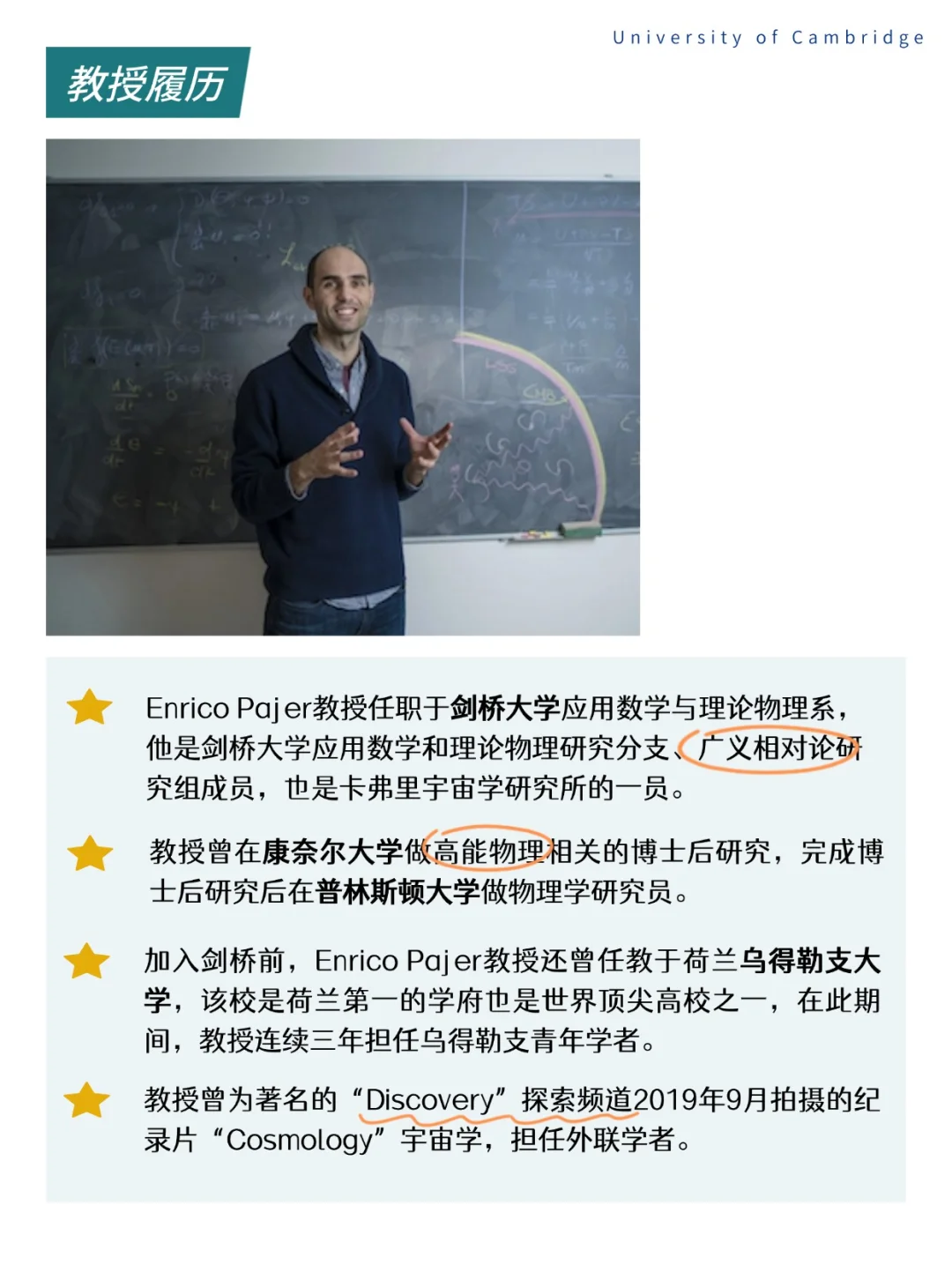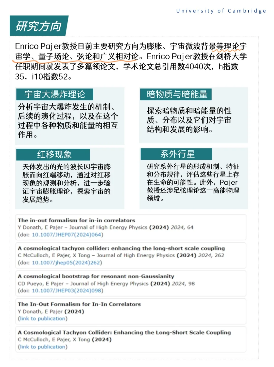●Enrico Pajer教授任职于剑桥大学应用数学与理论物理系,他是剑桥大学应用数学和理论物理研究分支、广义相对论研究组成员,也是卡弗里宇宙学研究所的一员。