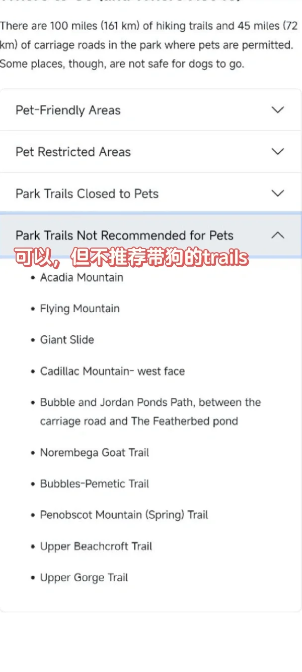 东部唯一拿得出手的国家公园Acadia来了!虽说已经十分狗狗友好,但有些trail山势陡峭坡度大,下面就是悬崖峭壁,所以不让带狗。图2/3列出了不让带狗和可以但不推荐带狗路线。公园一共100多条trails,带狗和不带狗几乎是不同的玩法。🐶体重超过50磅大狗需谨慎,太费人了,这次要不是专门带了狗子徒步腰带我们根本走不下来。下面推荐两条经典环线: