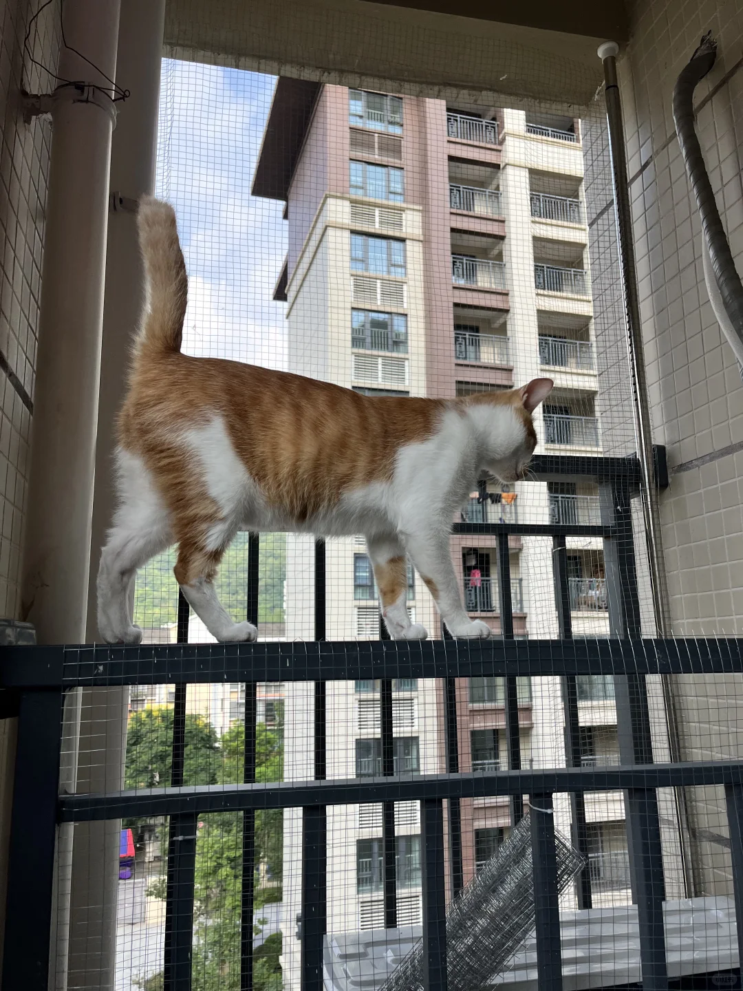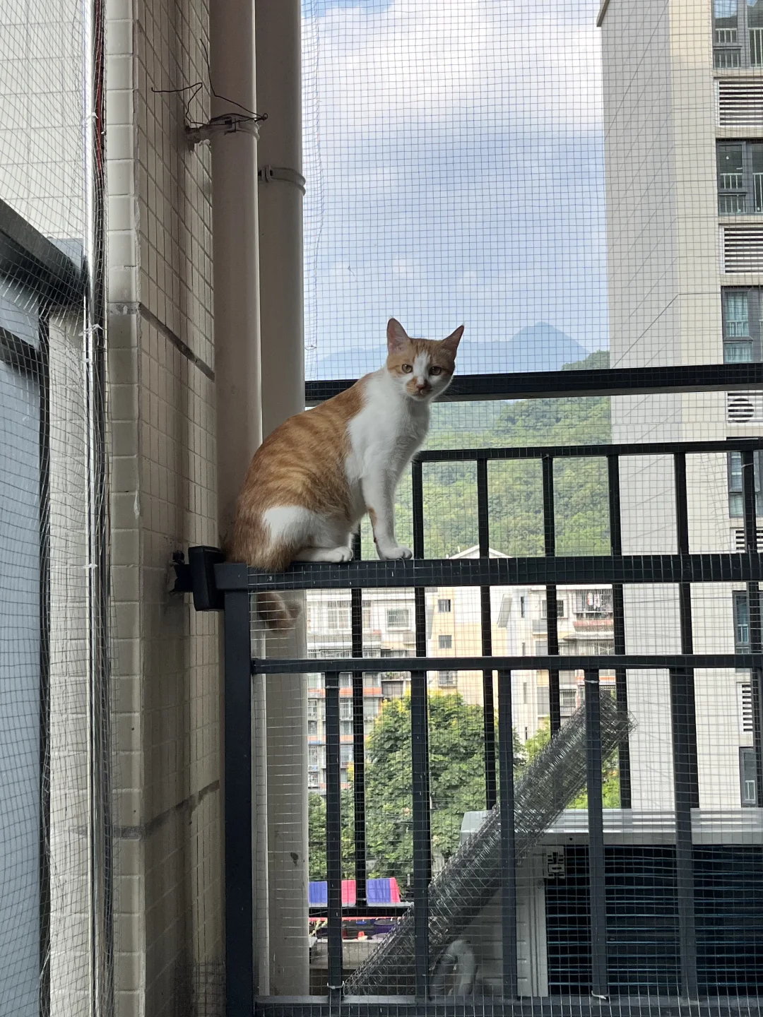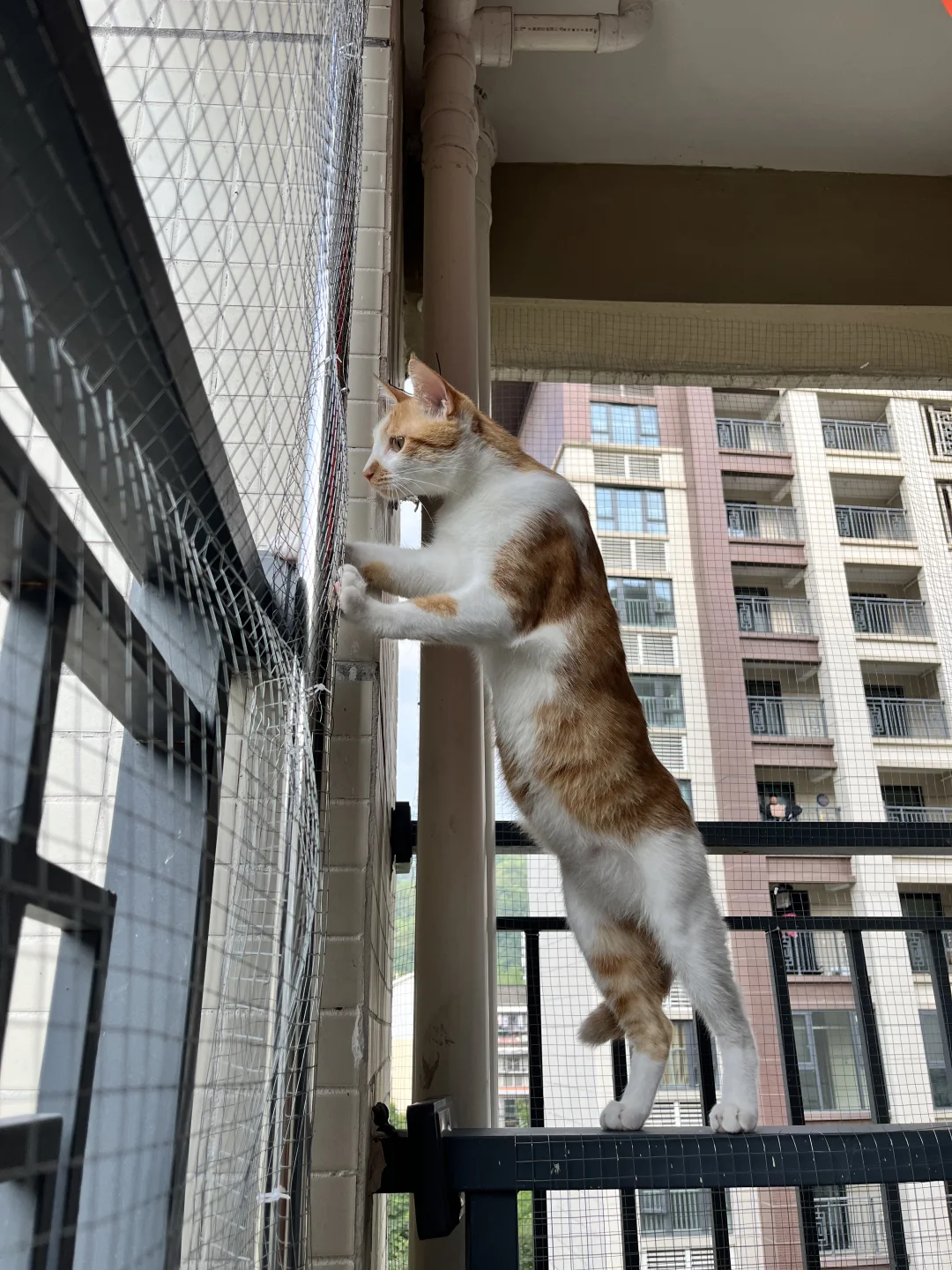 今天!他一下就跳上了最右边的栏杆,幸好我在最外层也加了铁丝网,他只能站上去看看风景,你别说天气好的时候拍照还挺好看的。🌟