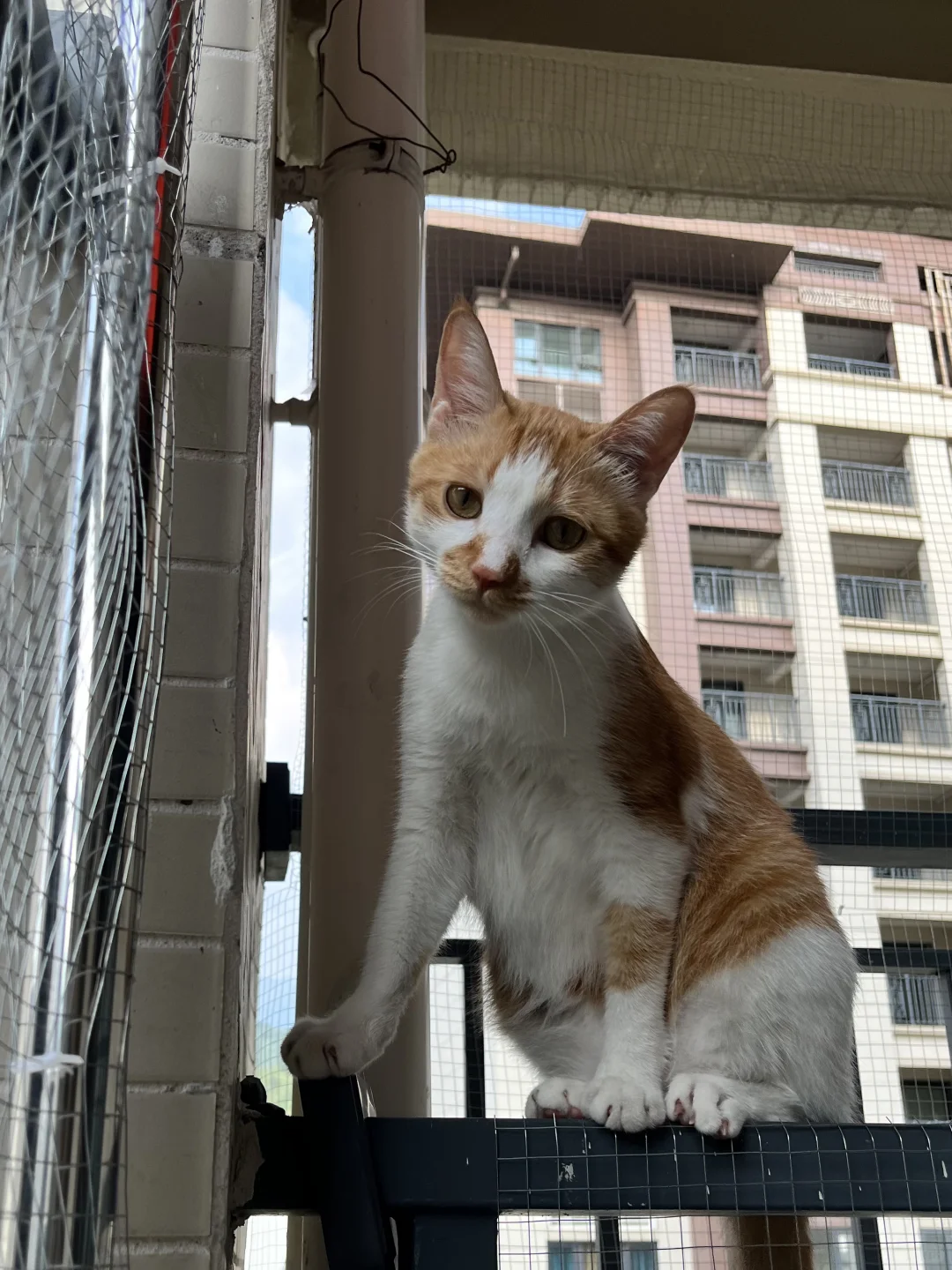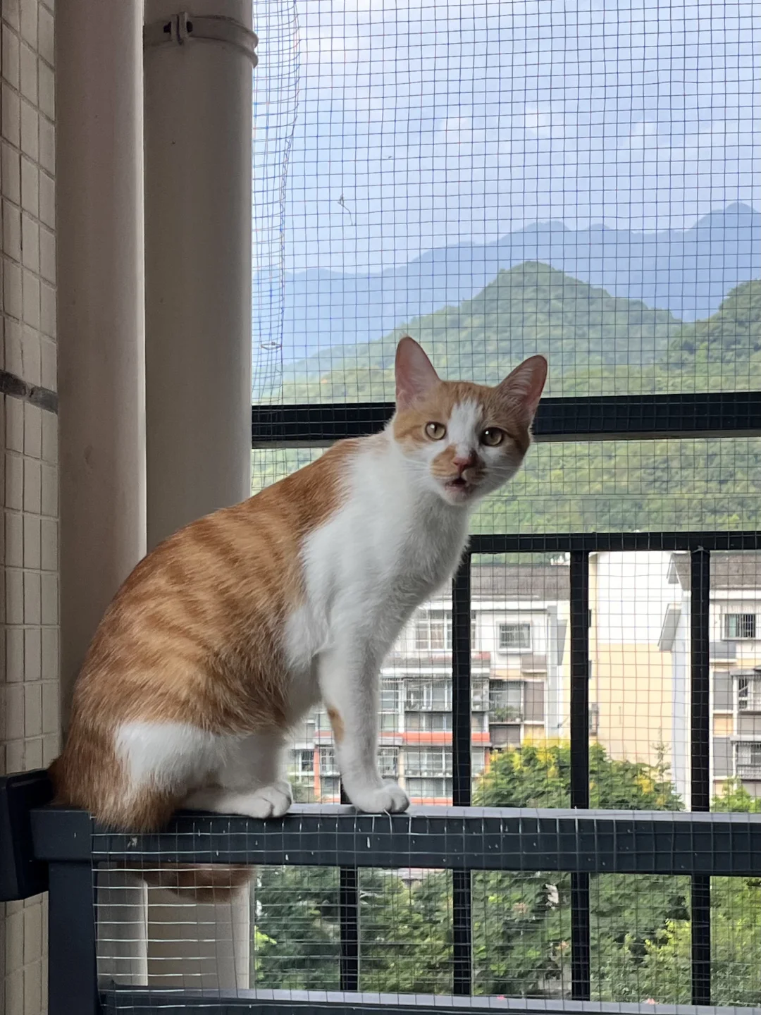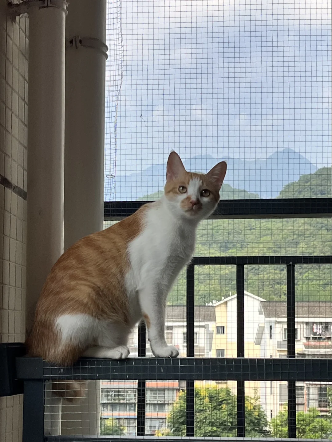 今天!他一下就跳上了最右边的栏杆,幸好我在最外层也加了铁丝网,他只能站上去看看风景,你别说天气好的时候拍照还挺好看的。🌟