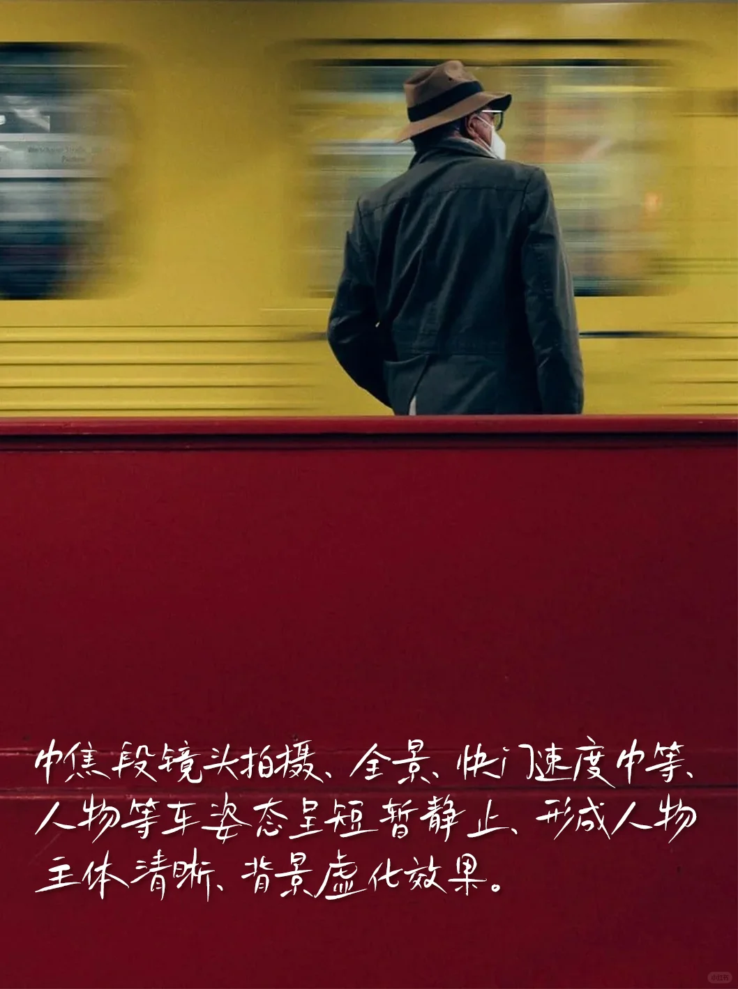 [五R]拍摄:中焦段镜头拍摄,全景,快门速度中等,人物等车姿态呈短暂静止,形成人物主体清晰,背景虚化效果。