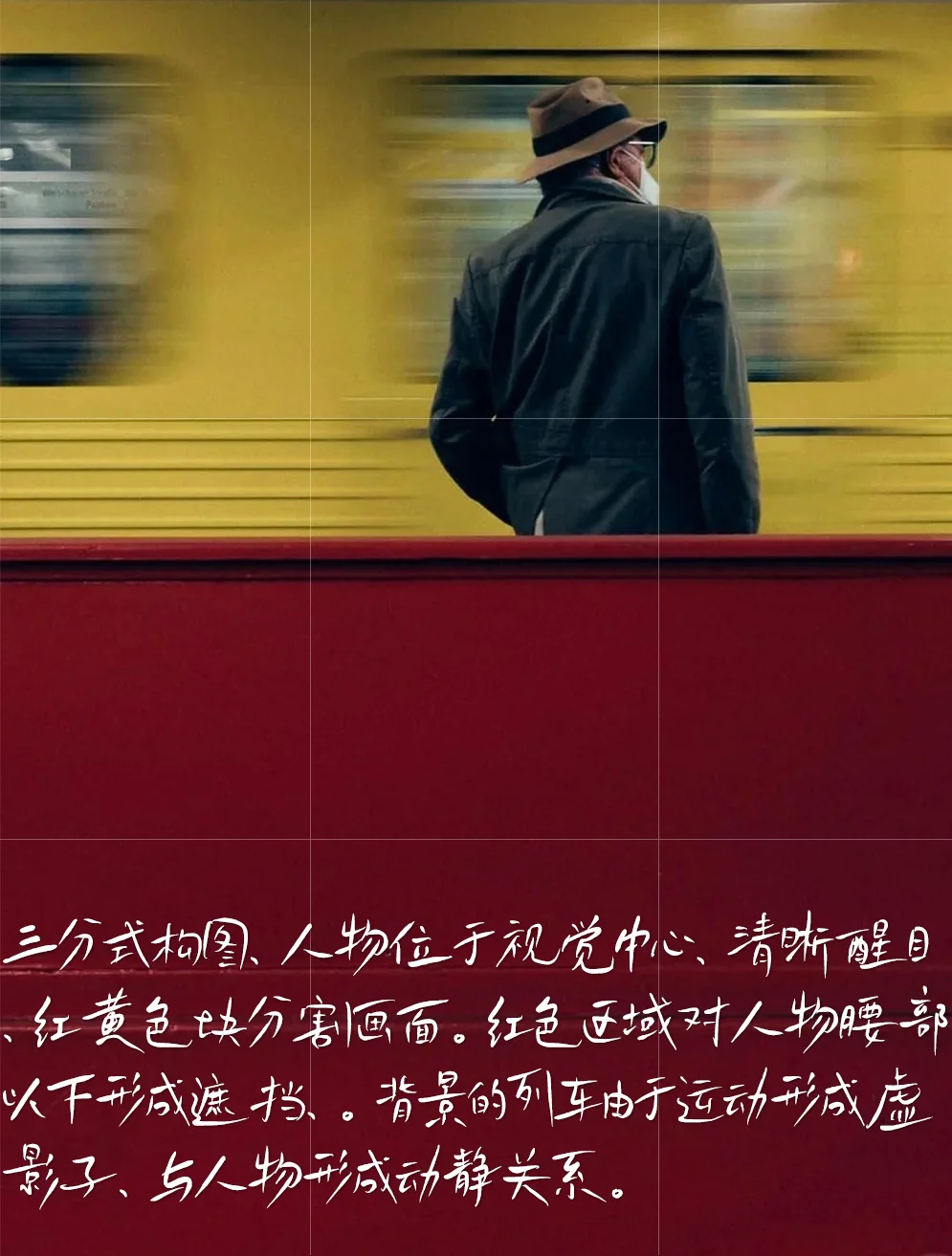 [一R]构图:三分式构图、人物位于视觉中心、清晰醒目红黄色块分割画面。红色区域对人物腰部以下形成遮挡。背景的列车由于运动形成虚影子,与人物形成动静关系。