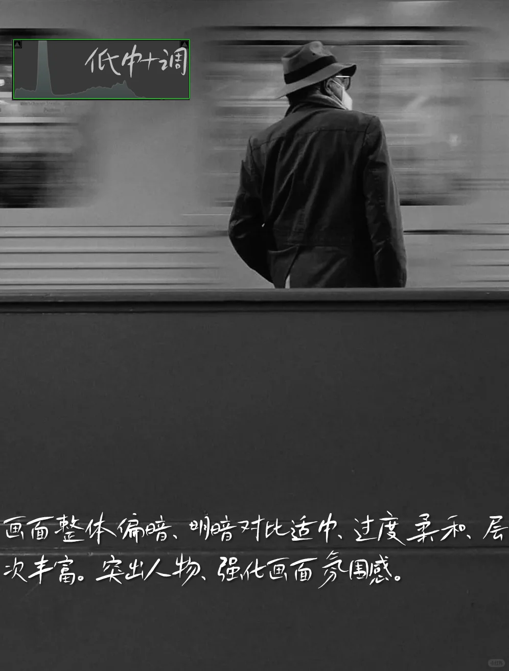 [三R]影调:画面整体偏暗,明暗对比适中,过渡柔和,层次丰富。突出人物,强化画面氛围感。