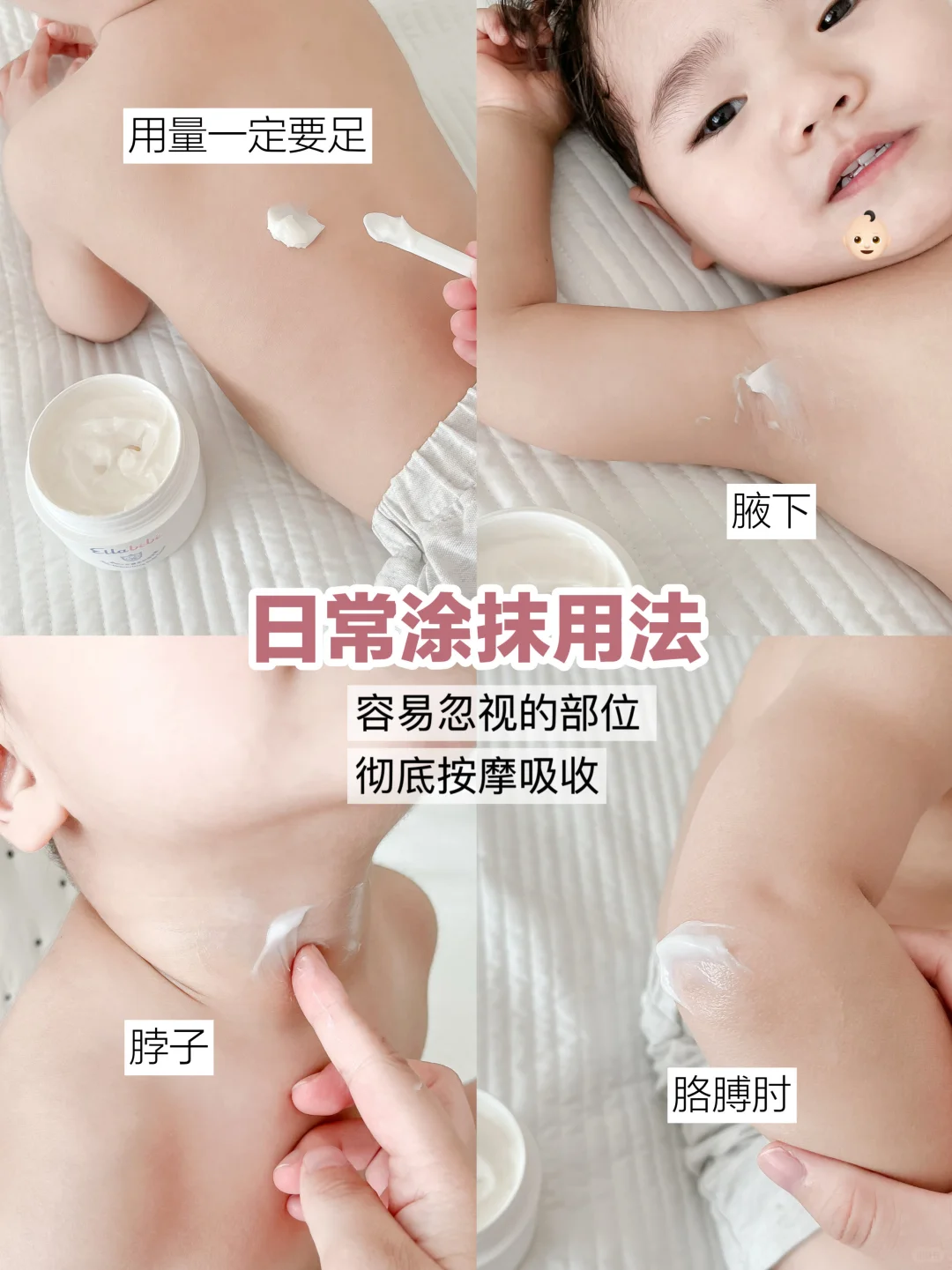 👉日常使用:宝宝洗澡后进行全身涂抹,用量一定要足,容易藏肉肉的脖子啊、腋下啊、还有容易干燥的手肘可以多涂一些,按摩至吸收