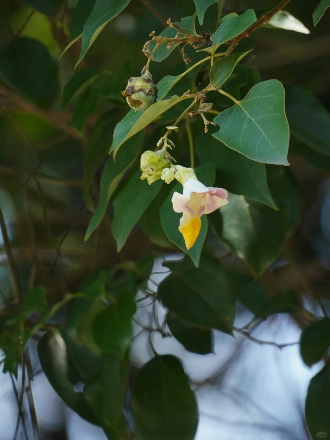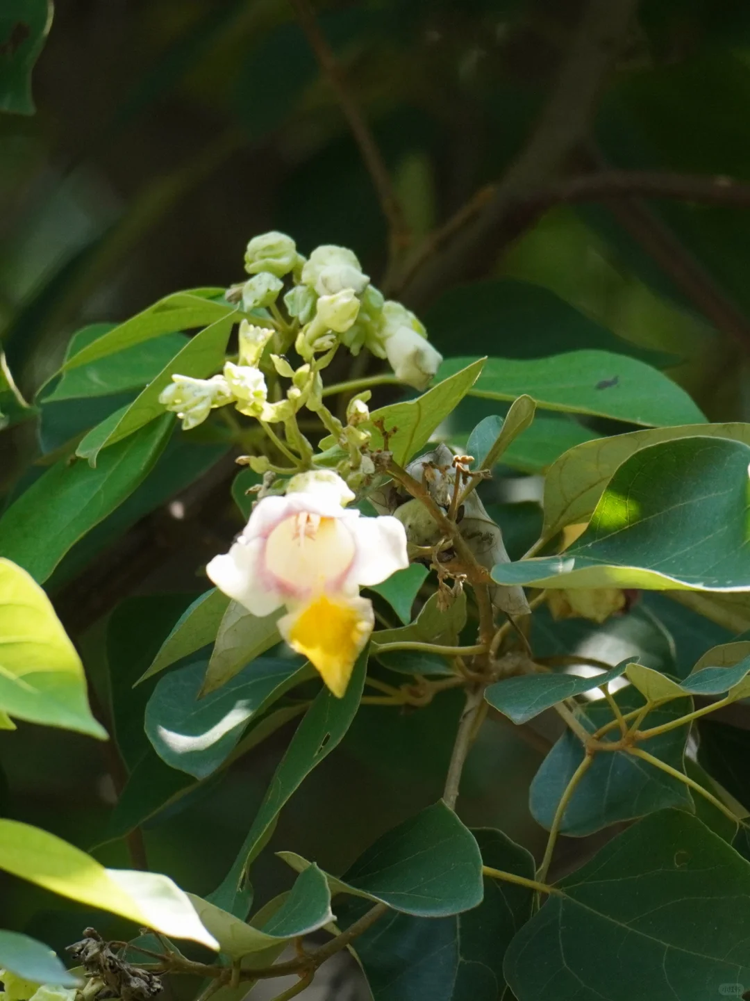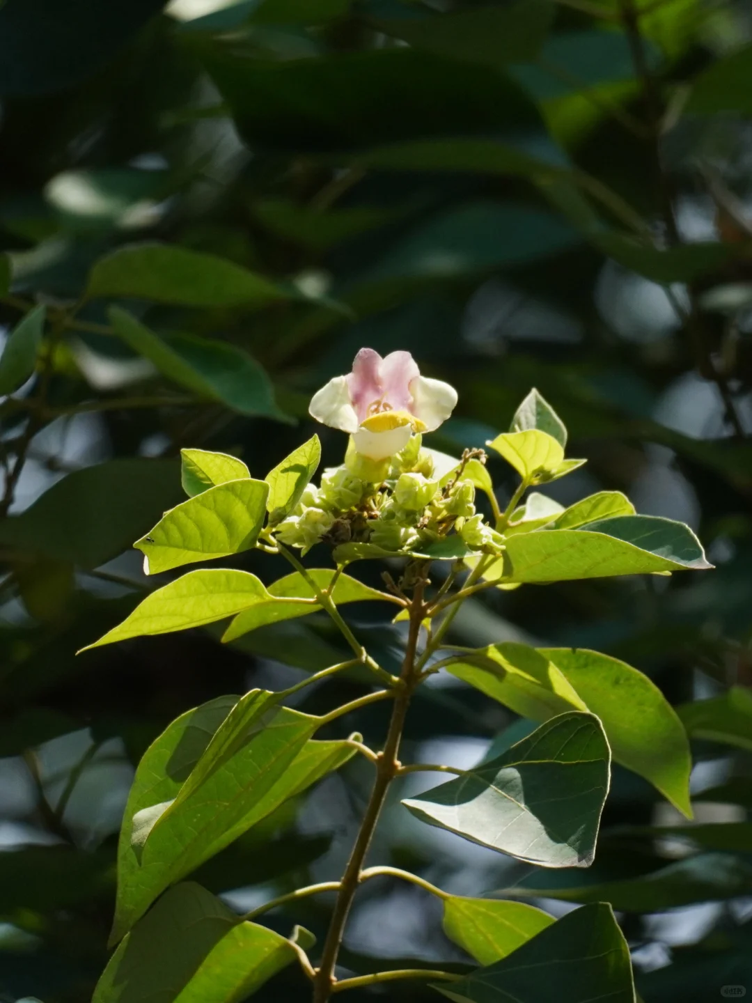 在凤凰山的葱郁林间,树梢轻摇,一朵朵小巧的花朵在微风中摇曳生姿,它们是苦梓,又名海南石梓,其名源自海南岛。