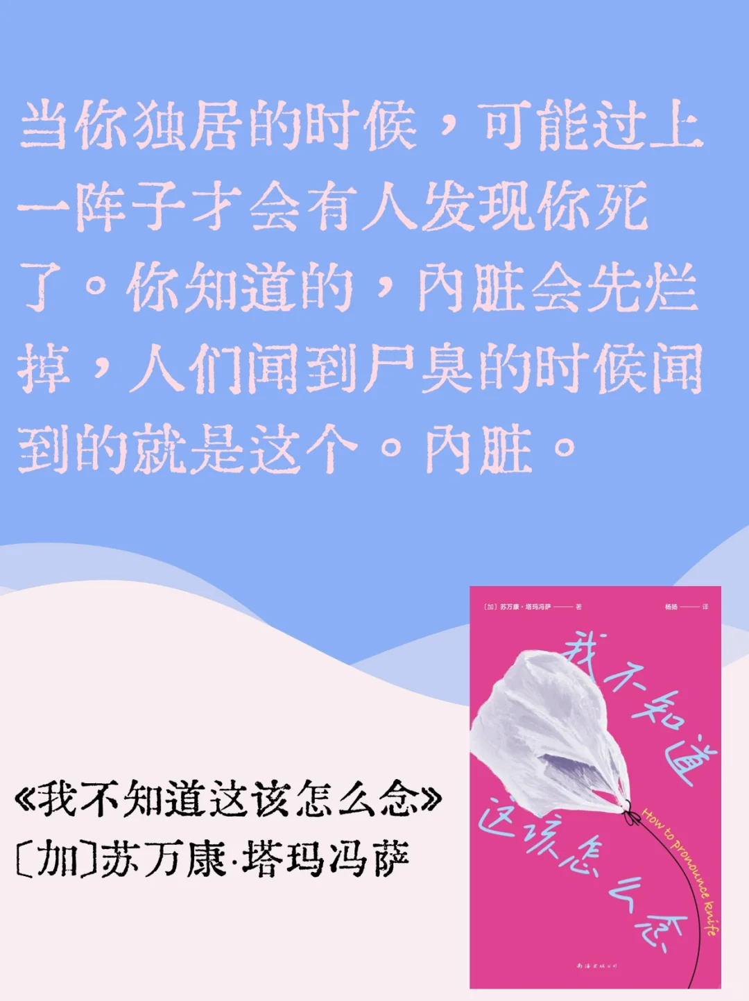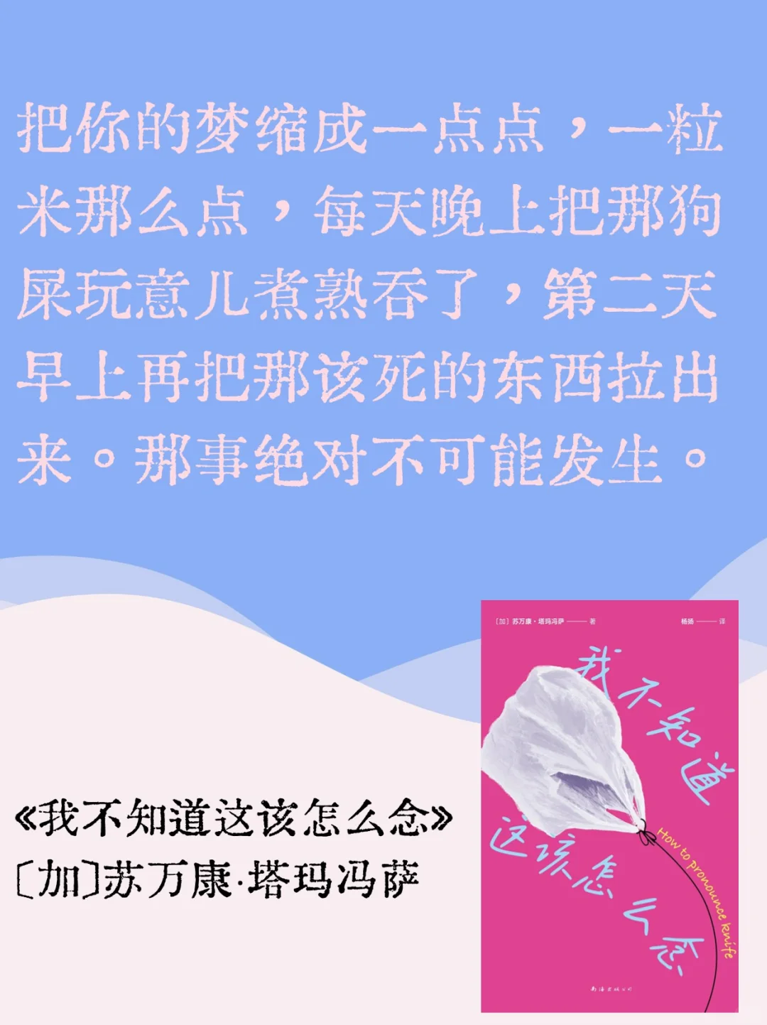 最近读完的一本有些沉重又不失幽默的小说集《我不知道这该怎么念》。我们希望人生是狂野,向往着诗和远方,但现实却常是狭窄的巷弄,黯淡的角落。小说集《我不知道这该怎么念》中的人物,就面临着这样的处境:在鸡肉加工厂里给鸡拔毛,在美甲沙龙里给人修脚,在流水线上给瓶子贴标签,在田地里徒手捉虫子……他们离开熟悉的故土,来到陌生的地方,是因为怀揣着开始新生活的希望。没有人是冲着这些不起眼的工作来的。