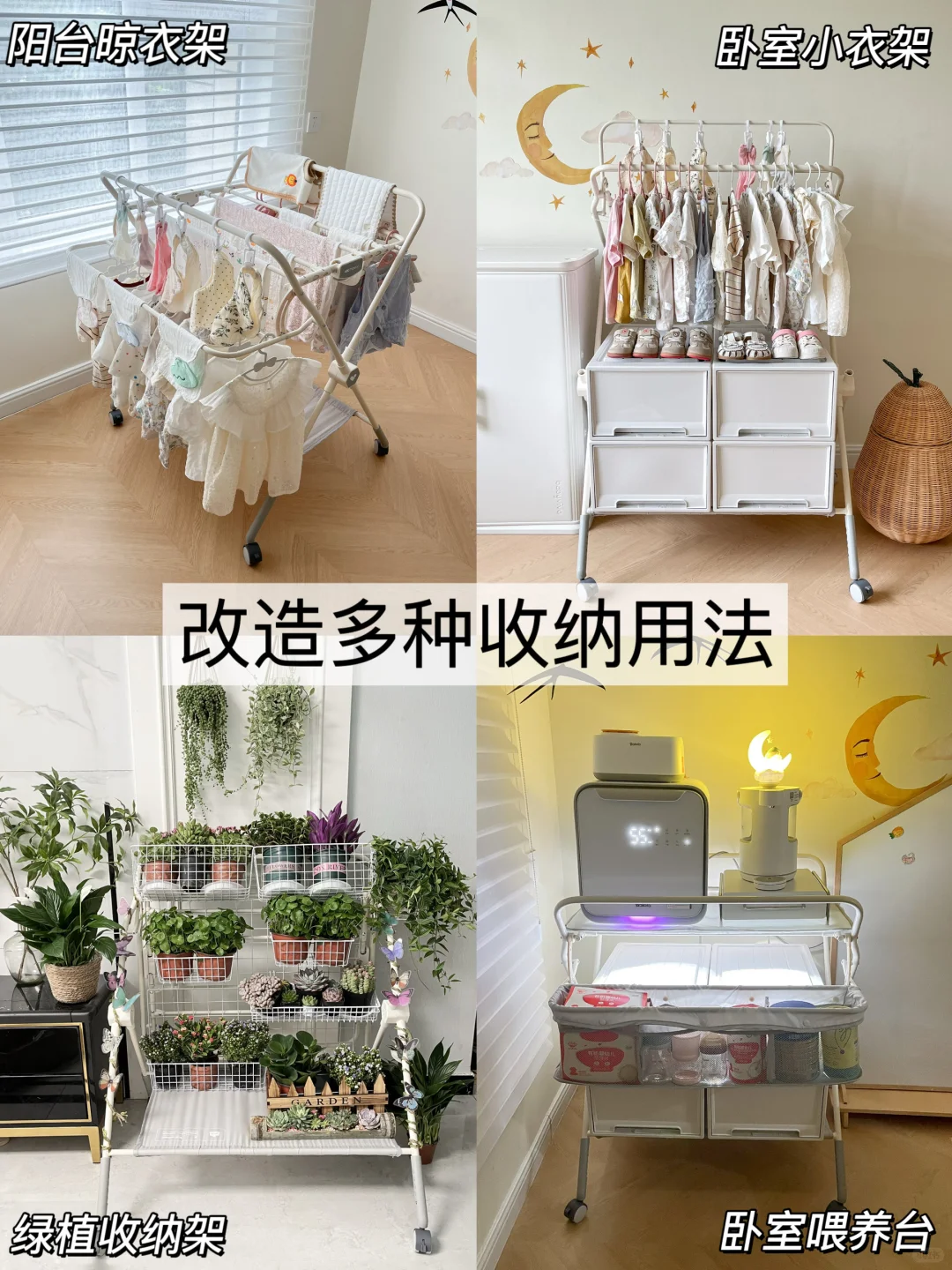 改造成小衣架放在卧室,搭配几个收纳盒,放宝宝的衣服、盖毯,床品,敲适合小户型