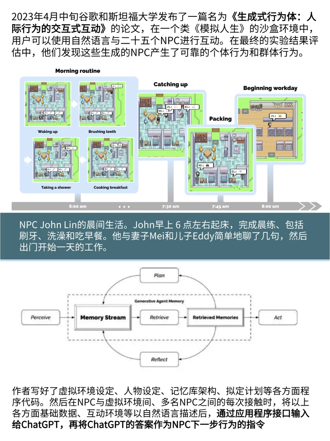 [二R]2023年4月中旬谷歌与斯坦福大学研究者的论文《生成式行为体:人际行为的交互式互动》,给出了新的路径:基于大语言模型的架构使用自然语言存储虚拟人的历史记录,并随着时间的推移将这些记忆综合成更高层次的自我思考,在此过程中虚拟人会动态地检索这些记忆并自我规划行动。