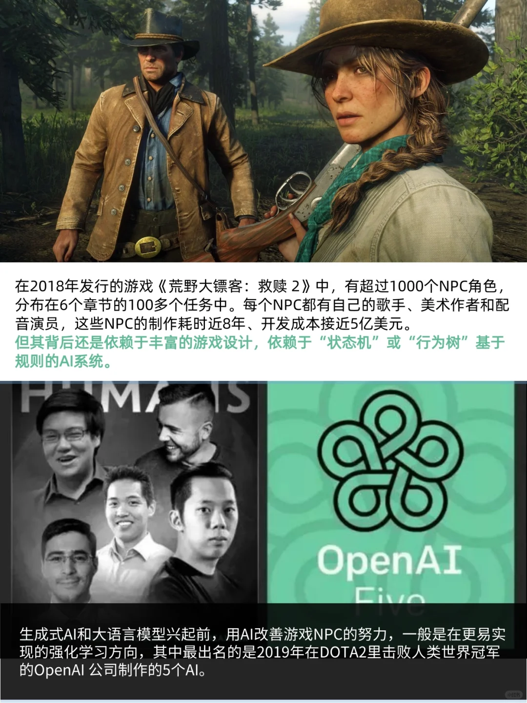 [一R] 生成式AI和大语言模型兴起前,用AI改善游戏NPC的努力,一般是在更易实现的强化学习方向,其中最出名的是2019年在DOTA2里击败人类世界冠军的OpenAI 公司制作的5个AI。