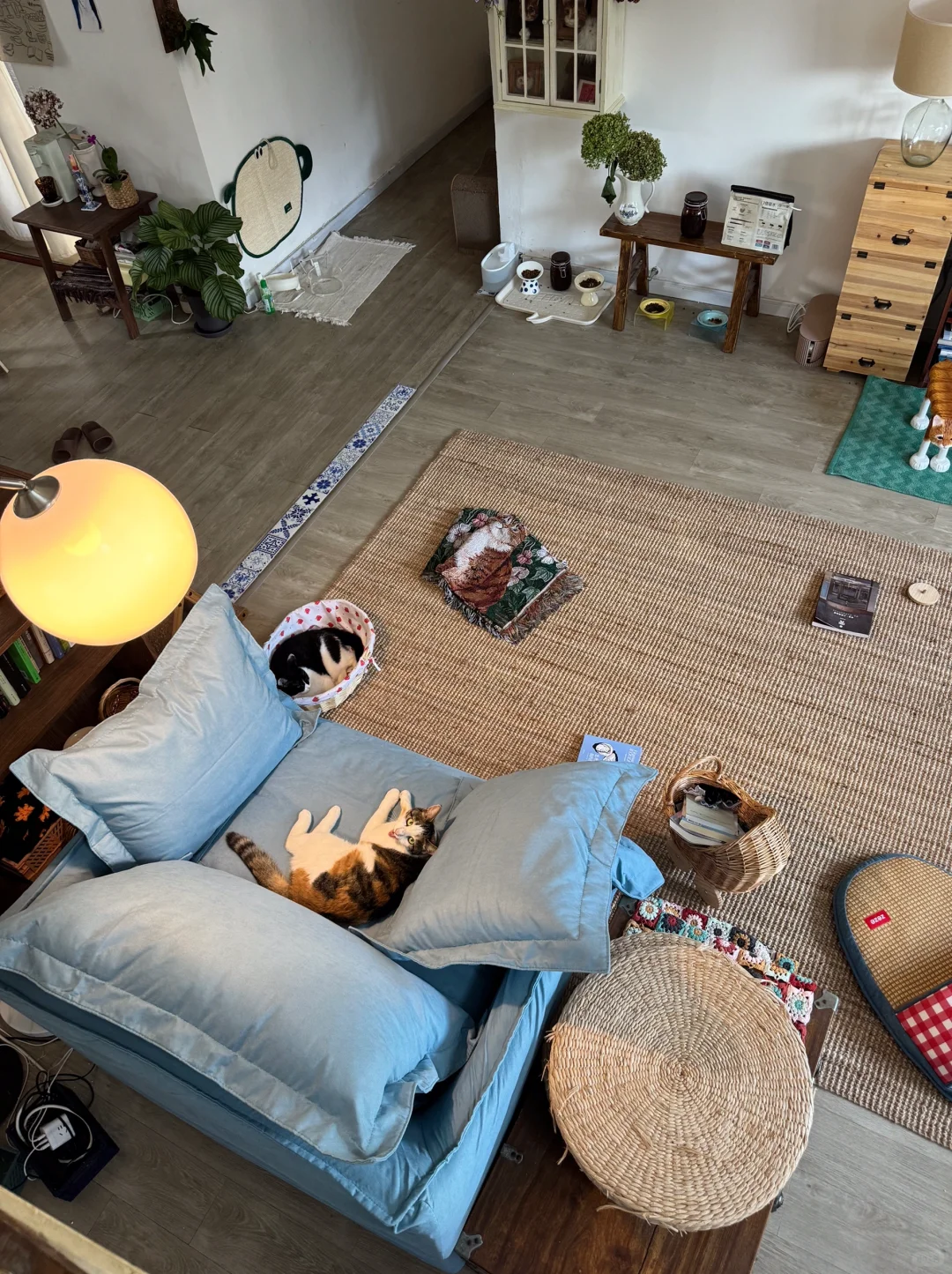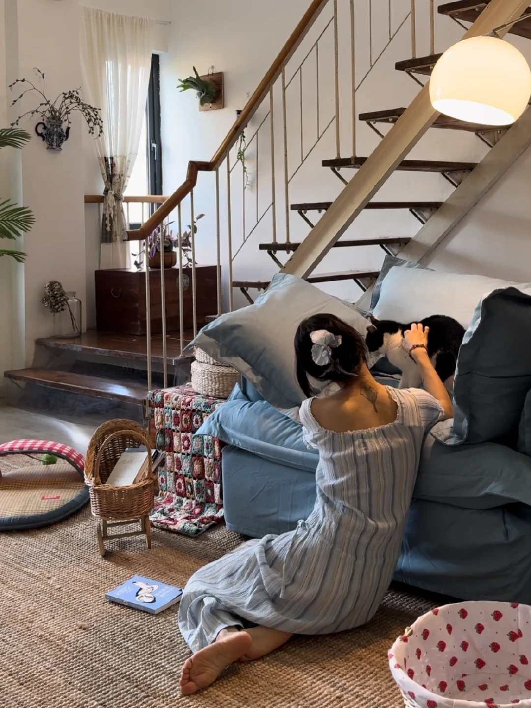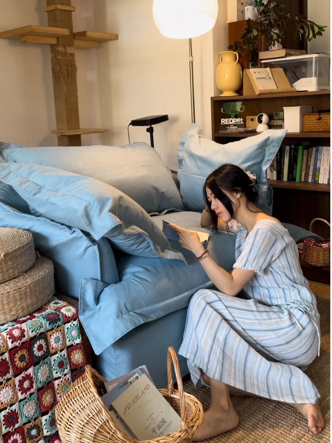白色沙发套用脏了,换成了蓝色,反倒给炎炎夏日增添了一抹凉意。 顶楼的夏日似乎更漫长些,如果不开空调,会热成薄纸片,黏糊糊的,泡水后才会膨胀。 自制了一杯蓝色饮料,奶牛猫趁我不备,率先用白手套试探,猫的好奇心到底能让它们体验怎样的世界呢? 此刻的世界是一场盛大的蝉鸣。 我在家里隐身,造蓝色的海。