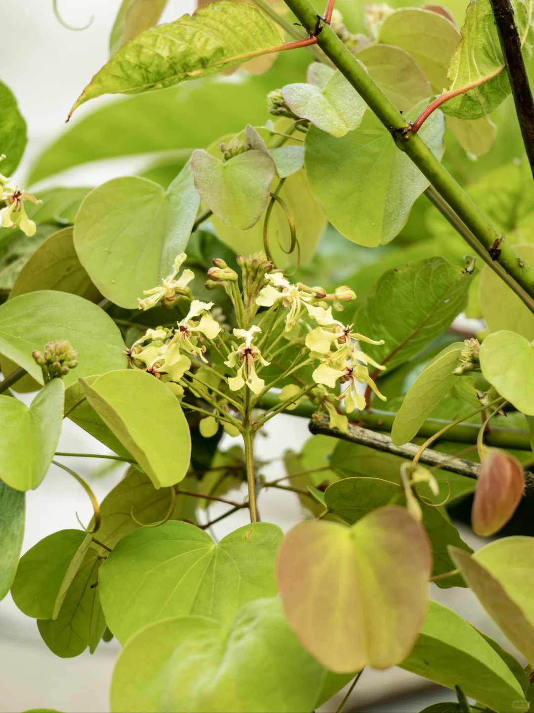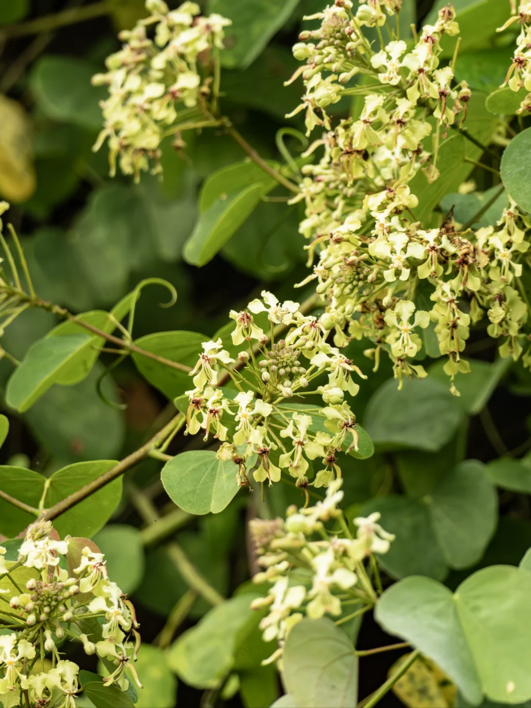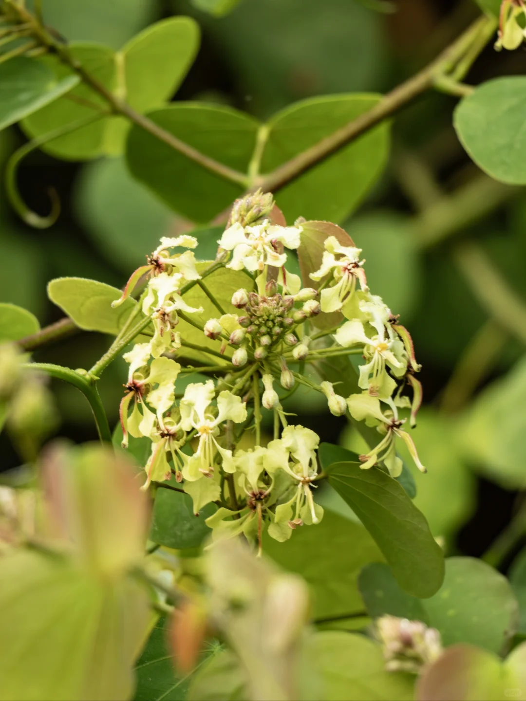 [向右R]植物:囊托首冠藤 [向右R]科属:豆科首冠藤属 [向右R]拍摄点:云南西双版纳 ——[星R]—— [种草R]植物笔记 囊托首冠藤,以其淡黄绿色的小花,犹如自然之手精心镶嵌的宝石,点缀在枝头。这些花朵小巧而精致,它们紧密排列成总状花序,犹如害羞的少女,依偎在枝顶,展露着它们的娇美。微风轻拂,小花摇曳,仿佛在诉说着春天的温柔诗篇。