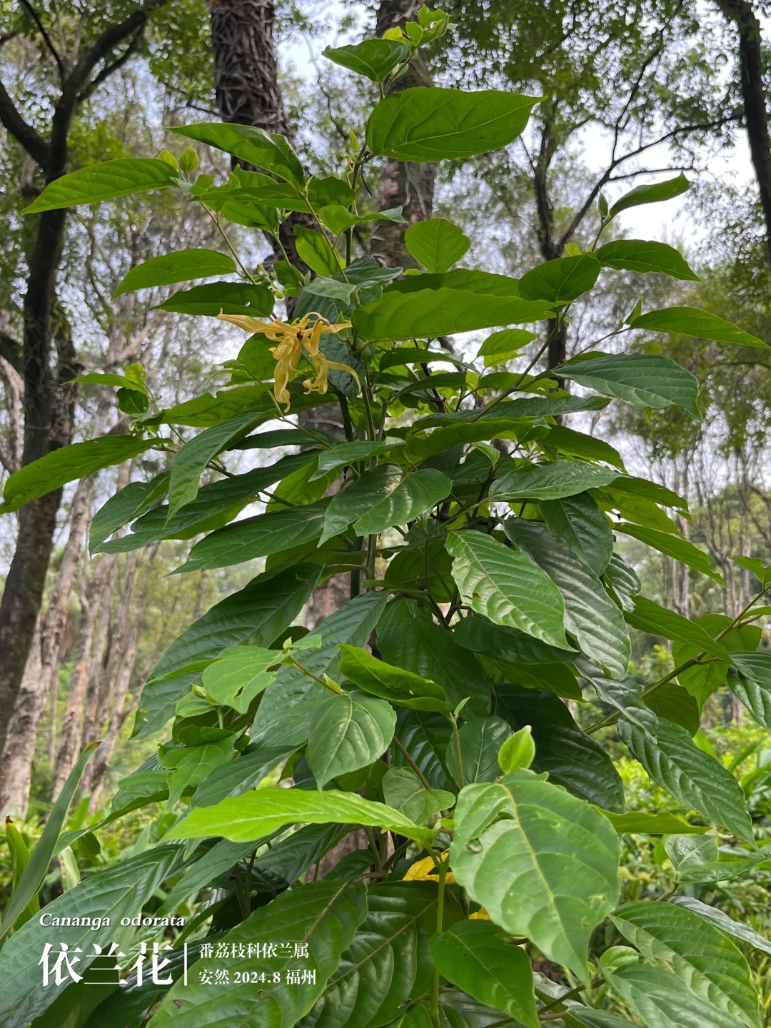 依兰花是在森林公园的意外发现,花黄绿色,花瓣卷曲,随风摇摆,跟之前打标的鹰爪花(详见我的笔记:福州植物打标430)颇为相似,且都是番茄枝科的植物。