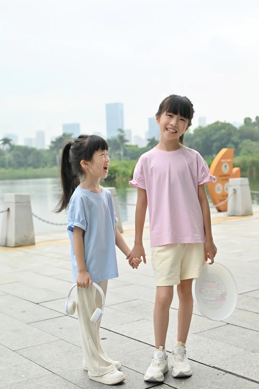 姐妹户外运动穿搭 小孩姐的眼光还真的很好,自己挑选的一整套好时髦,纯棉的,透气性好,适合运动穿。