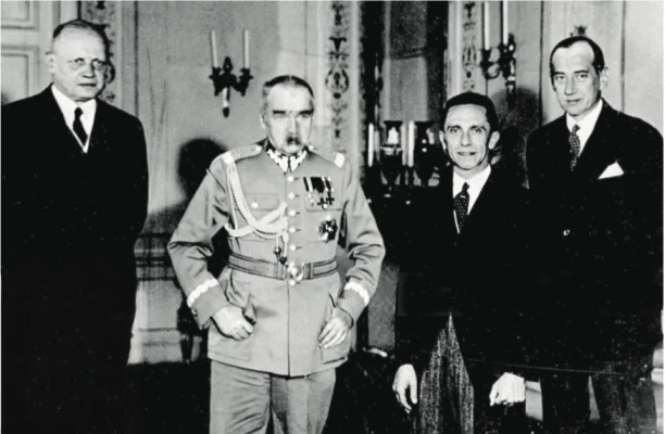 图5:德国外交特使毛奇伯爵、毕苏斯基、戈培尔、波兰外长贝克( 从左至右 )在华沙合影,约摄于1934年。纳c上台之后德波关系一度回暖,双方于1934年签订《波德互不侵犯宣言》,并将公使馆升格为大使馆。戈培尔此次访波即为向波方宣传“德国和平政策”