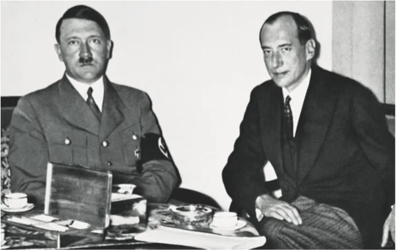 图6:1935年7月,小胡子会见波兰外长贝克(右)。二战前波兰和纳c德国在反苏问题上找到共同语言,使得波兰当局产生了错觉,认为小胡子出身奥地利,不会像普鲁士军国主义者那样对波兰怀有刻骨仇恨沆瀣一气
