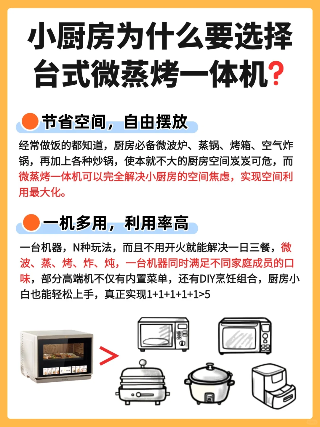 在厨房空间越来越小的今天,集成式厨电成了很多小户型家庭的首选👍🏻微蒸烤一体机就是典型代表!它集合了📍微波、蒸箱、烤箱、空气炸锅于一体,对于小厨房家庭来说,实在是无法抗拒。