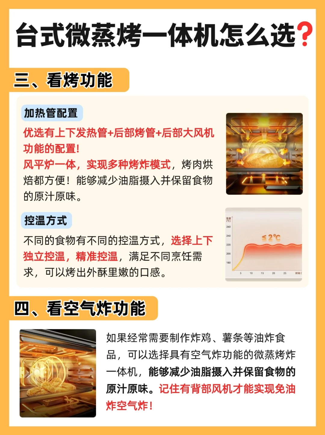 1️⃣优选有上下发热管+后部烤管+后部大风机功能的配置!风平炉一体,实现多种烤炸模式