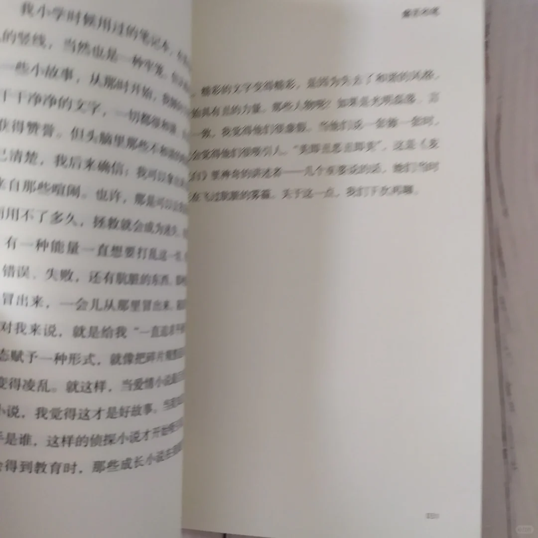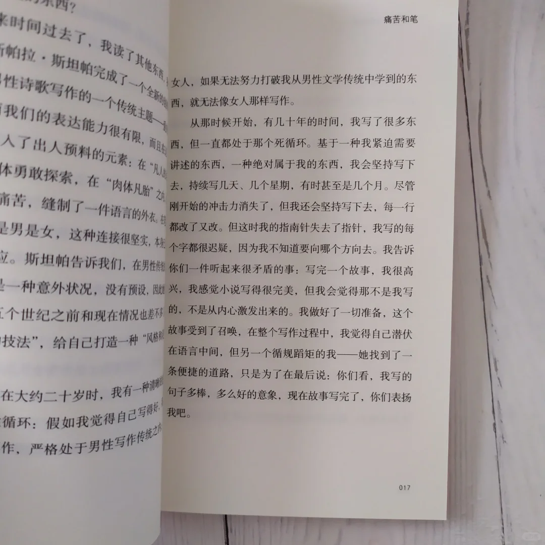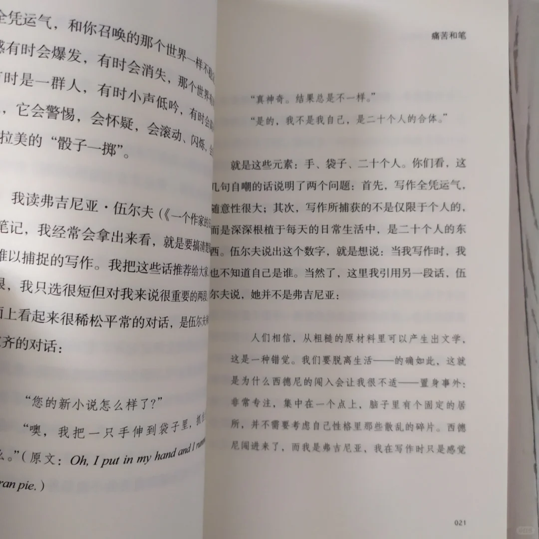 作者在《页边和听写》中谈到自己的写作的切身感受,把她的感受很细腻的描述出来。但凡稍微从事过写作,甚至是经常写作文的人,肯定也会有跟作者一样的切身体会的。她说:写了很多东西,但处于了一种死循环。每当他有一种急迫的需要讲述的东西时。他会坚持一直写下去,甚至几天,几个星期。但是却又很容易迷惑了方向,不知道要向哪个方向去,就好像指南针失去了指针。感觉小说写的很完美时,那些并不是他写出来的,而是从内心激发出来的东西。有时能够感觉到内心有某种东西,想要打破常规,想要找到新的风格和灵感。协作的灵感有时会爆发,有时却会消失。内心时而好像有一群人在高声呼喊,时而好像就只剩一个人小声的低吟。这些写作过程中的心理感受和内心活动,真是既形象又真切!我想搞创作的人肯定会有同感的。