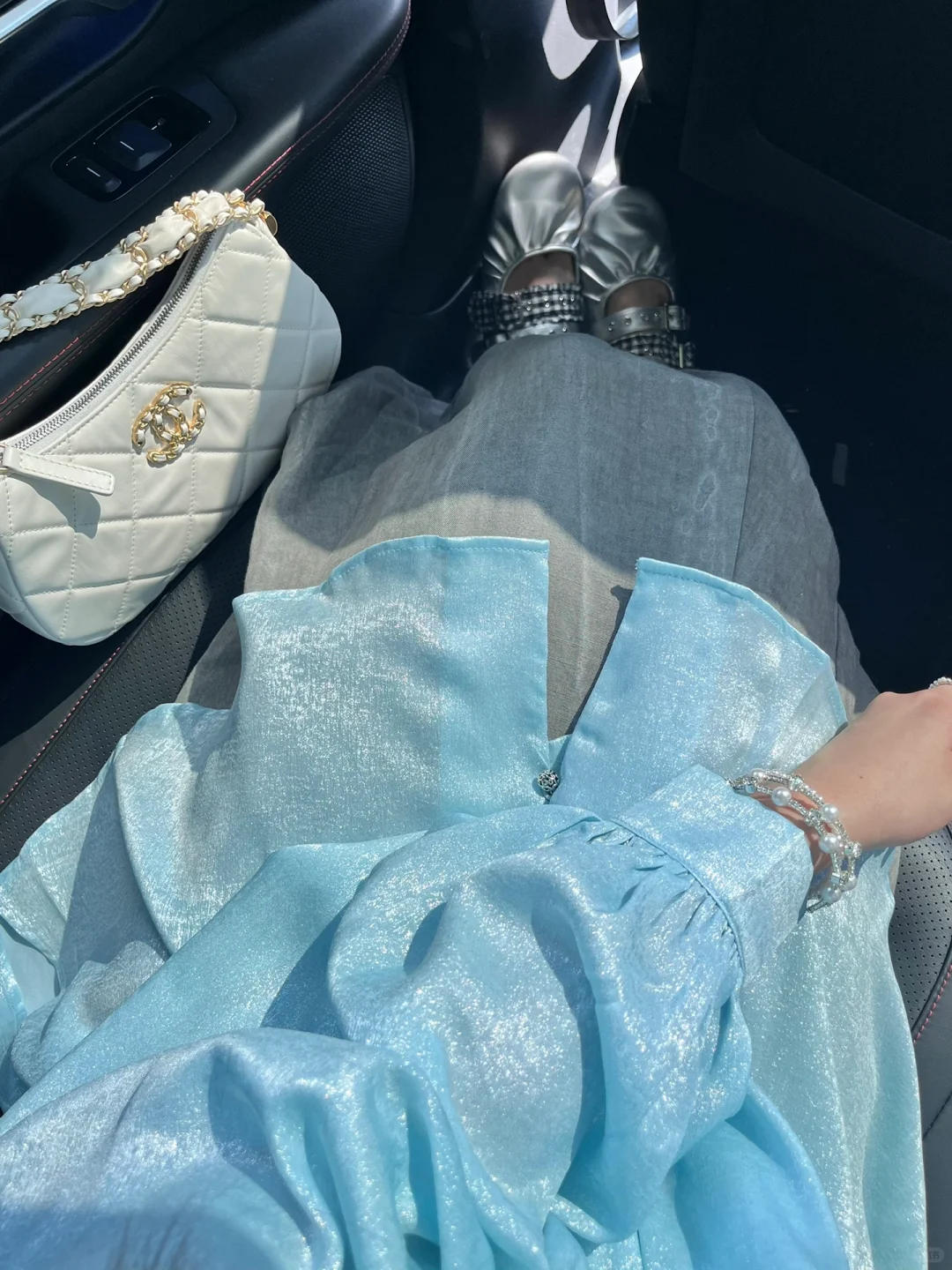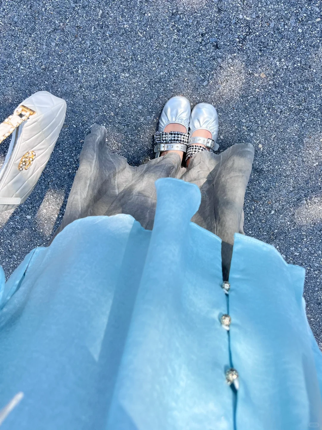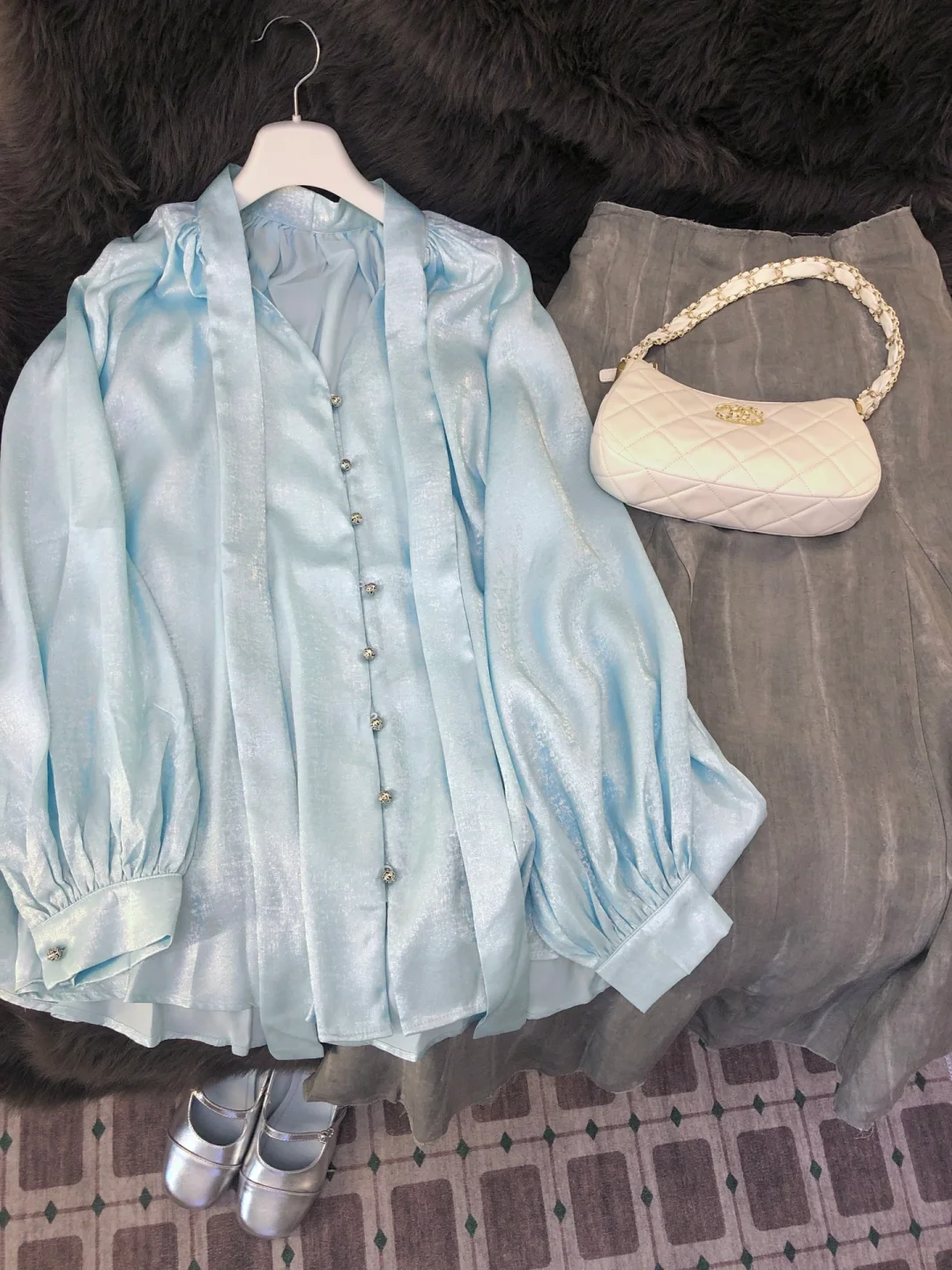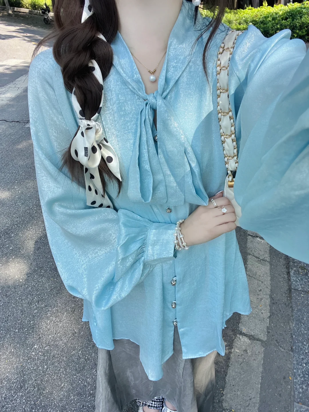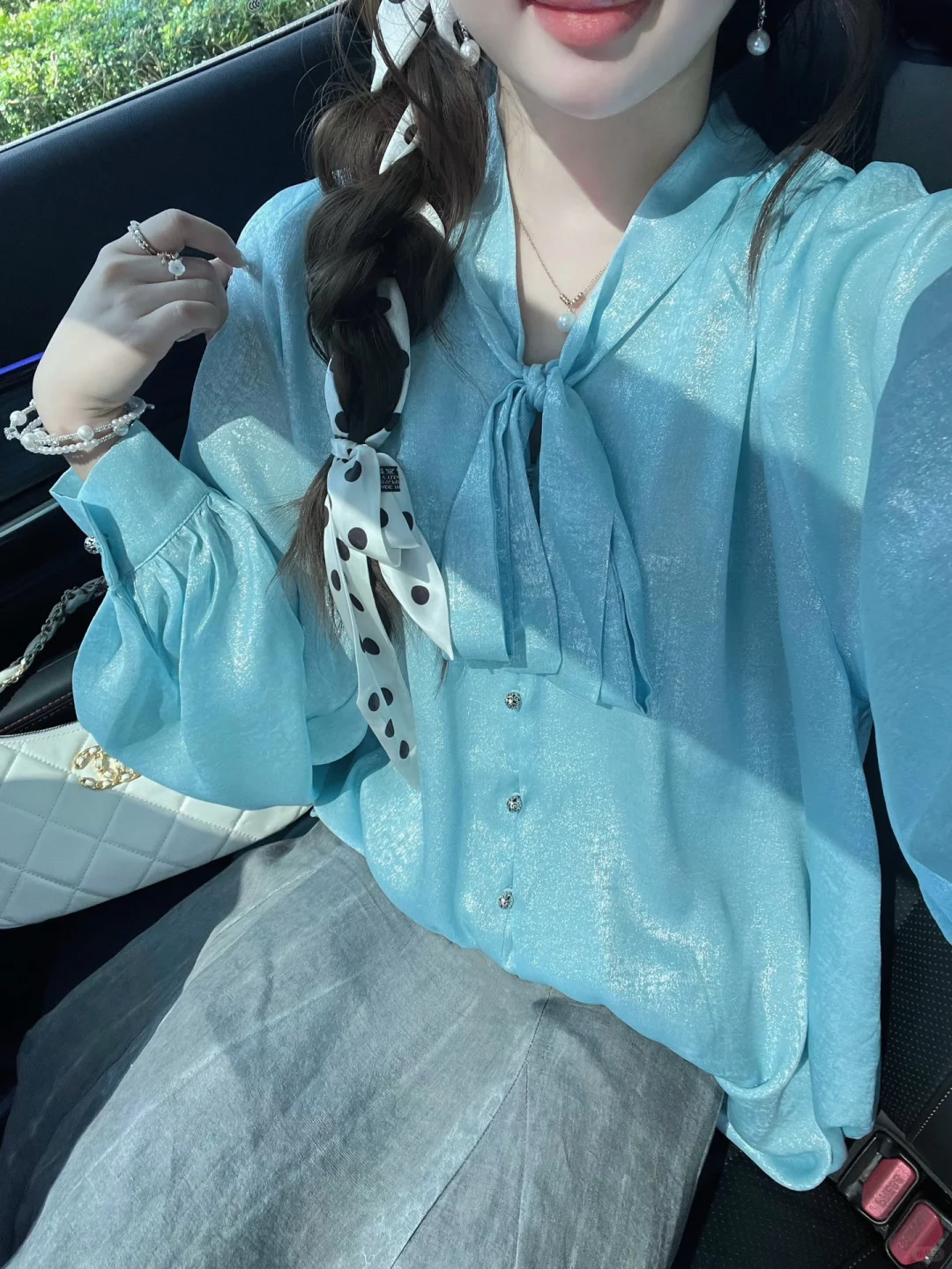 衬衫✖️丝带绑发真的有点小复古的感觉! 秋天大家配衬衫都可以试试 今天这个衬衫blingbling的✨ 阳光下会比较蓝(可以看图4图5live图无滤镜) 6就是室内我拍的颜色