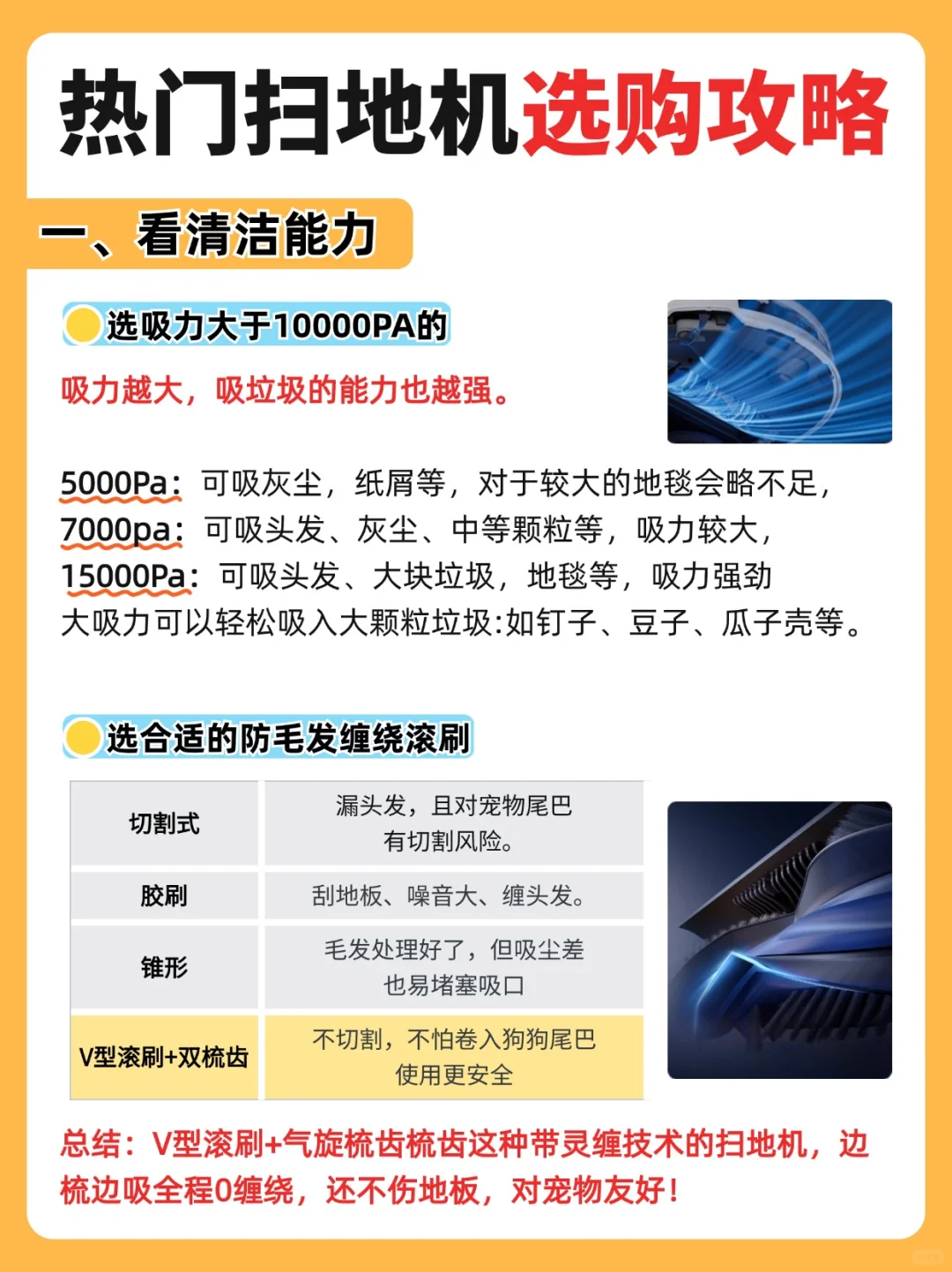 2️⃣选真正省心不缠绕的滚刷:V型滚刷+气旋梳齿这种带灵缠技术的扫地机,边吸边梳全程0缠绕,还不伤地板,对宠物友好!