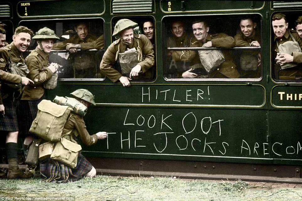 1939,英国苏格兰,士兵们在出发去战场的火车上写下“小胡子!小心了!穿裙佬们来啦!” (德军在二战时叫苏格兰士兵“来自地狱的女人”)