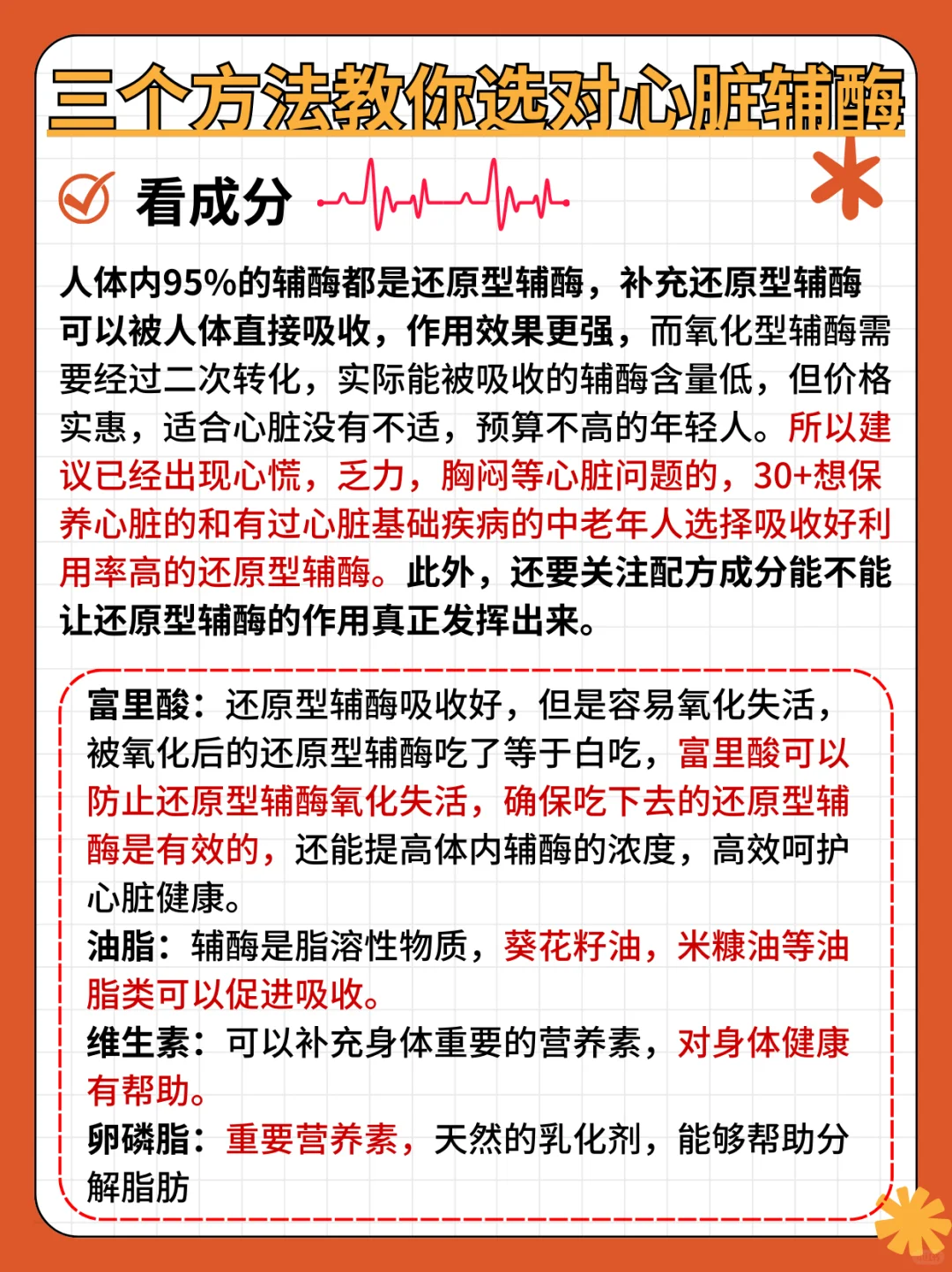 人体内95%的辅酶都是还原型辅酶,补充还原型辅酶可以被人体直接吸收,作用效果更强,而氧化型辅酶需要经过二次转化,实际能被吸收的辅酶含量低,但价格实惠,适合心脏没有不适,预算不高的年轻人。所以建议已经出现心慌,乏力,胸闷等心脏问题的,30+想保养心脏的和有过心脏基础疾病的中老年人选择吸收好利用率高的还原型辅酶。此外,还要关注配方成分能不能让还原型辅酶的作用真正发挥出来。