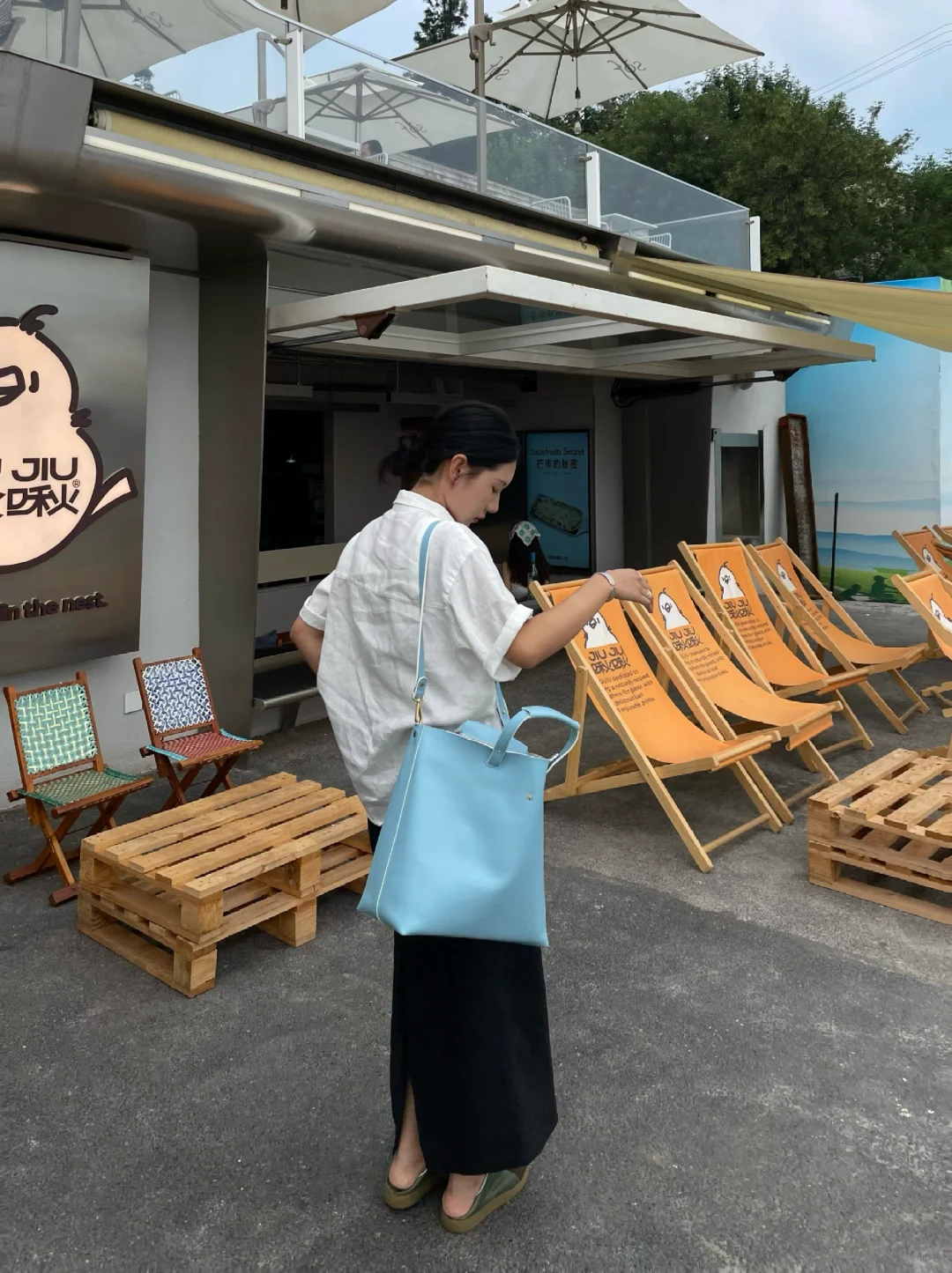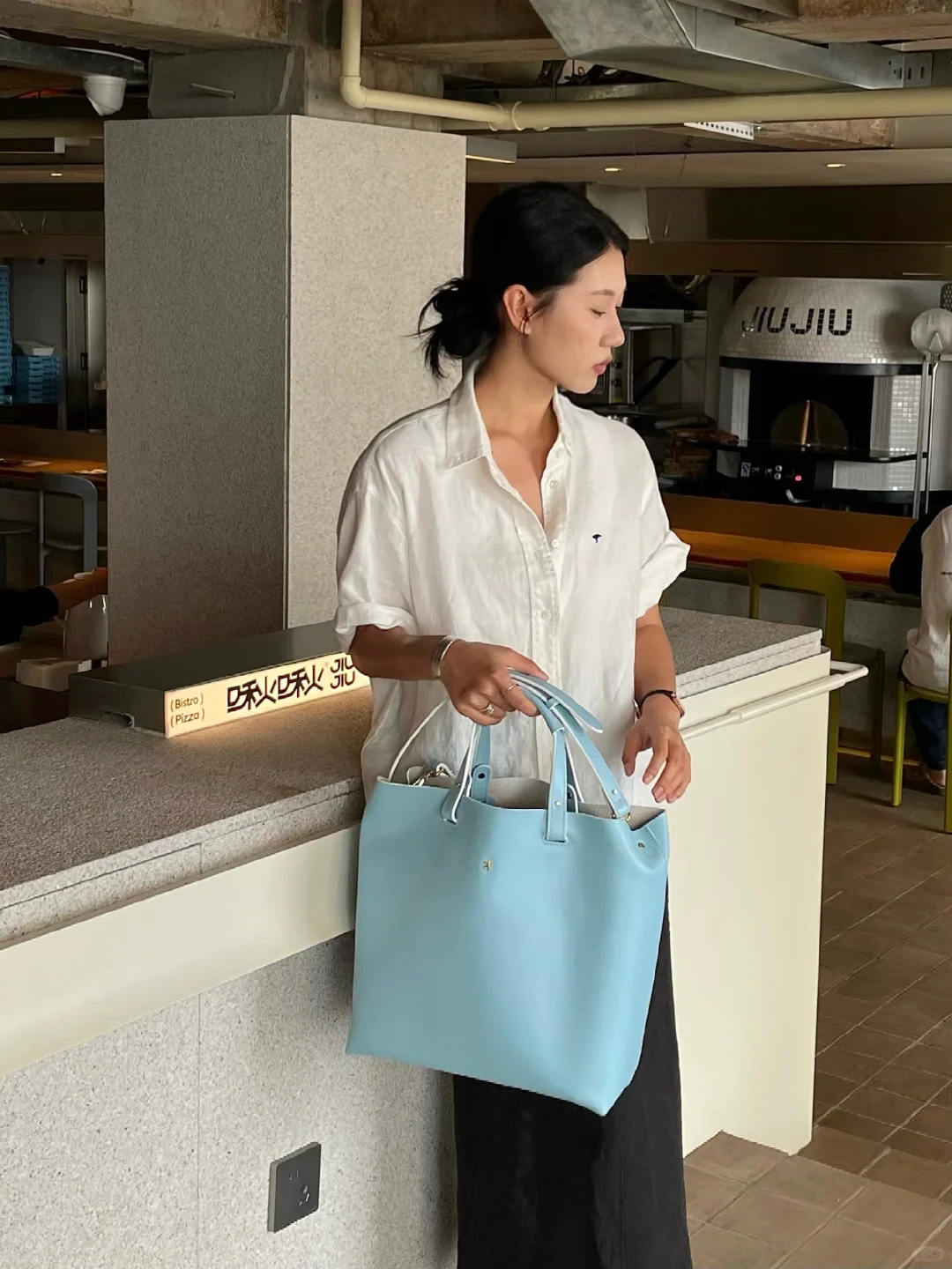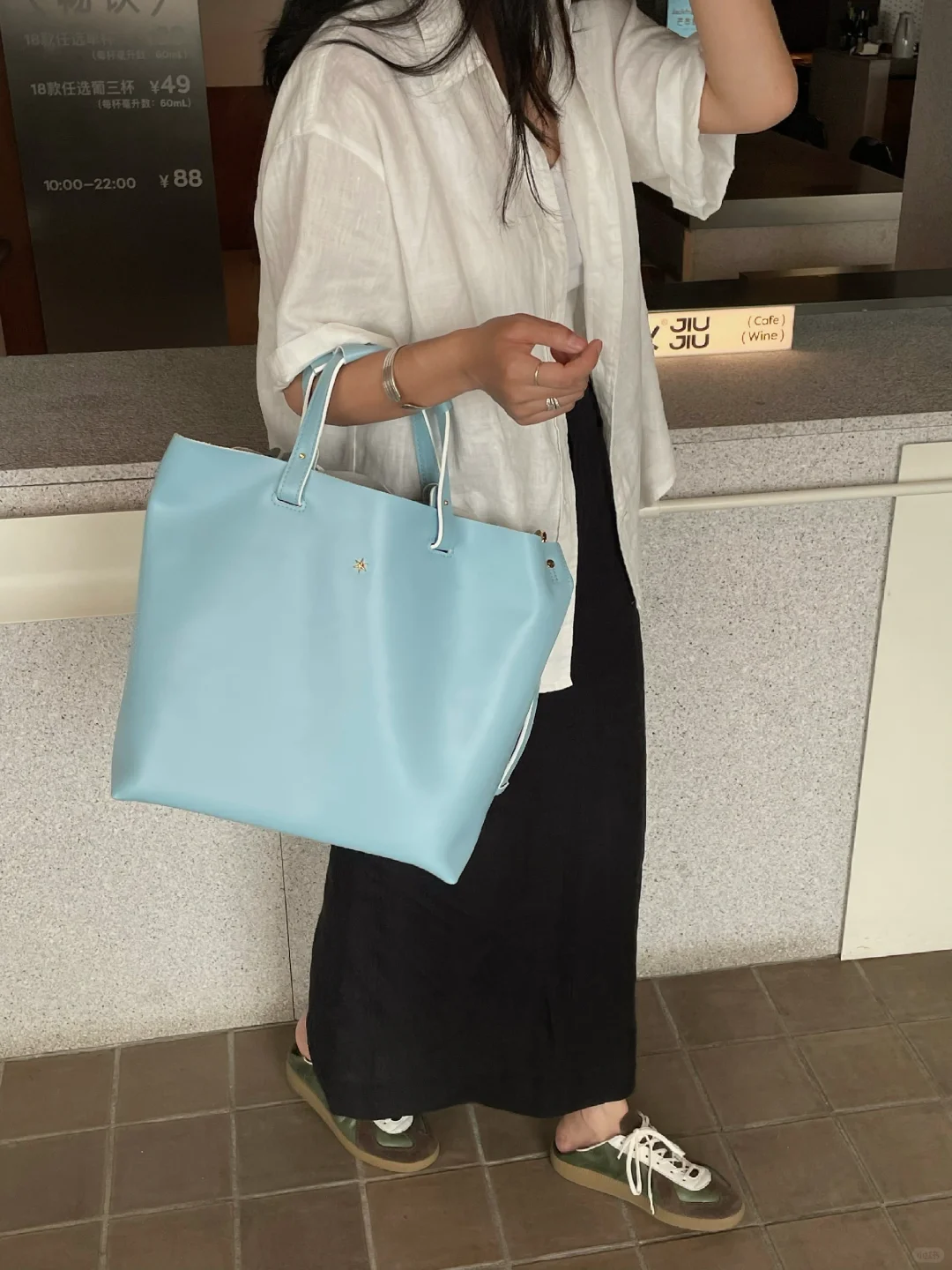 在啾啾实现看海自由 坠近很爱蓝色的包包 通勤休闲都很适配 搭配亚麻材质 是我喜欢的松弛小精致氛围 -