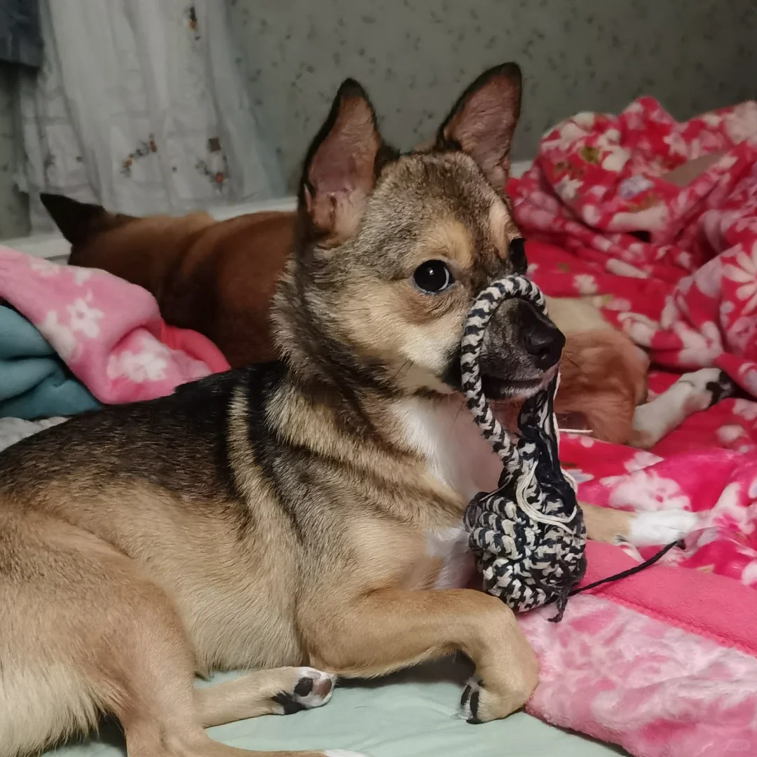 爸比想逗全家桶就把她最喜欢的小蝴蝶藏起来了,全家桶撅着狗嘴一直盯着挂在床头灯上的蝴蝶,爸爸在她嘴筒子上挂了个球也不玩,就一脸呆滞傻傻盯着灯。