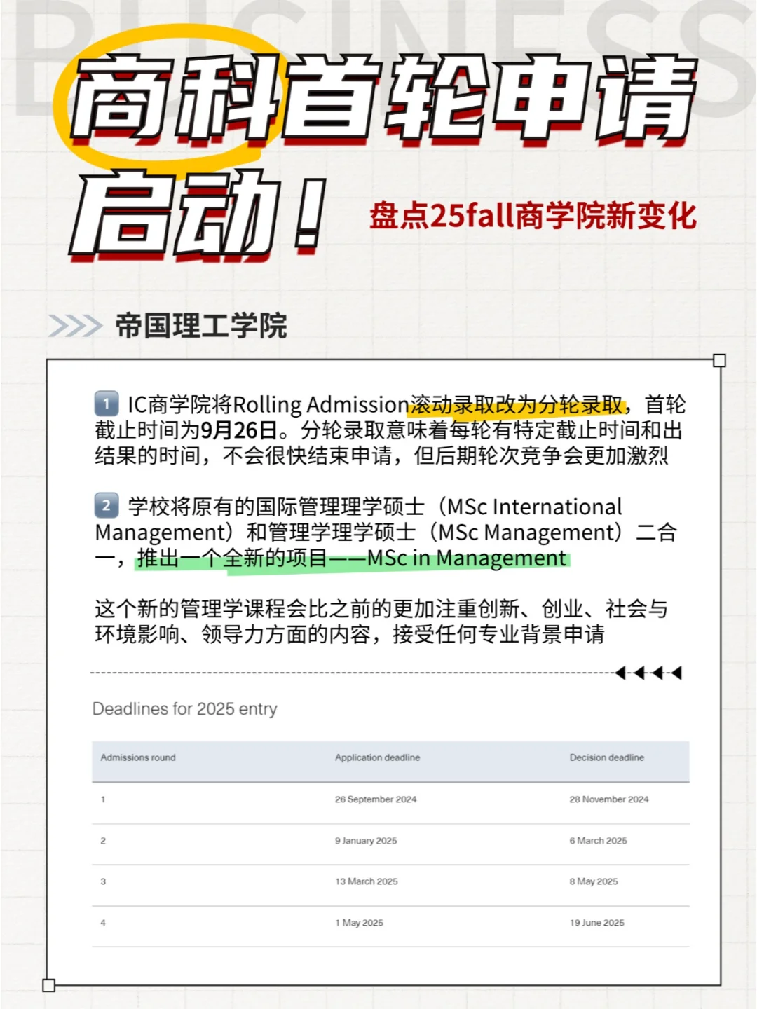 [一R] 帝国理工商学院将原有的国际管理理学硕士(MSc International Management)和管理学理学硕士(MSc Management)二合一,推出全新的MSc in Management,同时申请由Rolling Admission滚动录取改为分轮录取,首轮截止时间为9月26日。