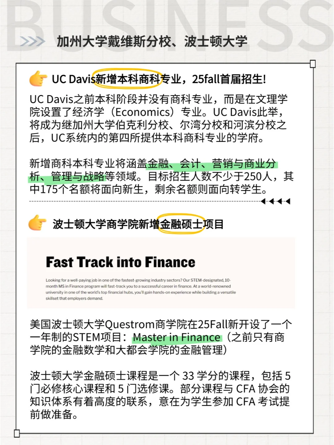 [三R] UC Davis新增本科商科专业,25fall首届招生。 新增商科本科专业将涵盖金融、会计、营销与商业分析、管理与战略等领域。UC Davis将成为UC系统内的第四所提供本科商科专业的学府。