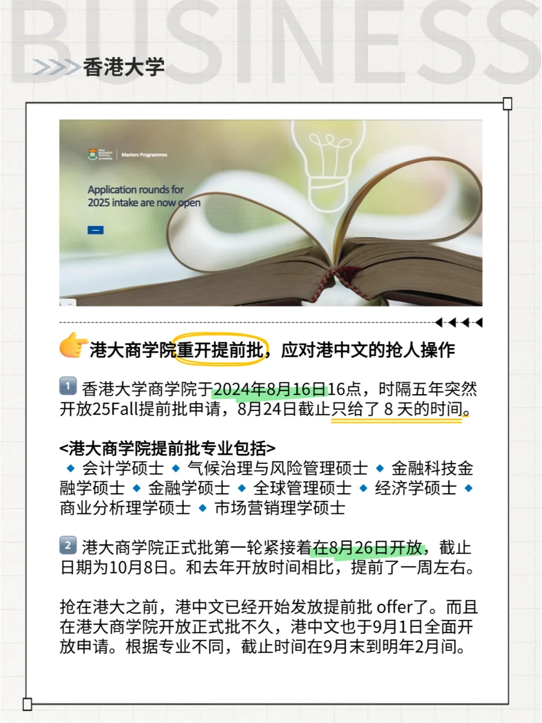 香港大学商学院 于2024年8月16日16点,时隔五年突然开放8大专业的25Fall提前批申请,8月24日截止只给了 8 天的时间。 正式批第一轮紧接着在8月26日开放,截止日期为10月8日。
