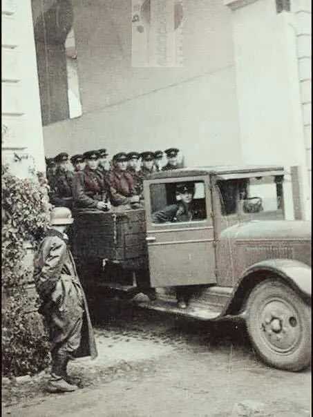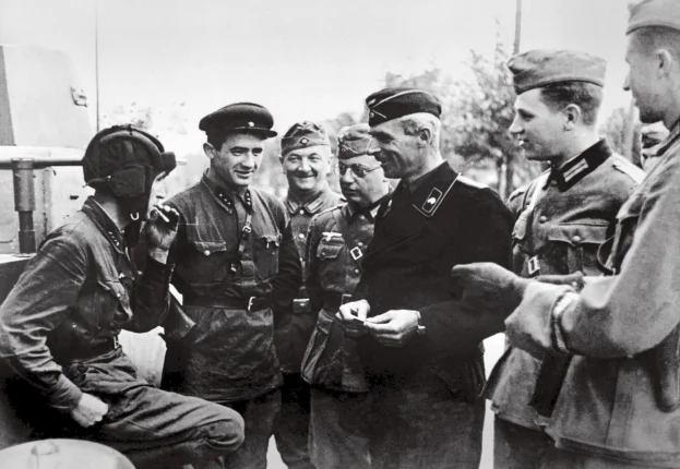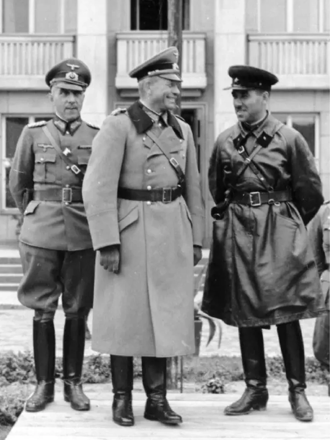 图4:德苏共同入侵波兰,苏联NKVD部(前身为契卡,后改组为克格勃)特工进入波兰布列斯特市,左边是一名德国防军士兵