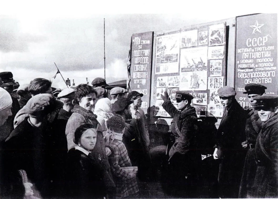 图8:1939年10月,苏军某坦克部队军官正在向维尔纽斯当地居民宣传苏联工人的生活状况。维尔纽斯为立陶宛古都,1920年波兰撕毁和约吞并该地,并强迫大批立陶宛人迁出。苏联占领波兰之后将此城重新划归立陶宛,并将立陶宛人重新迁入维尔纽斯