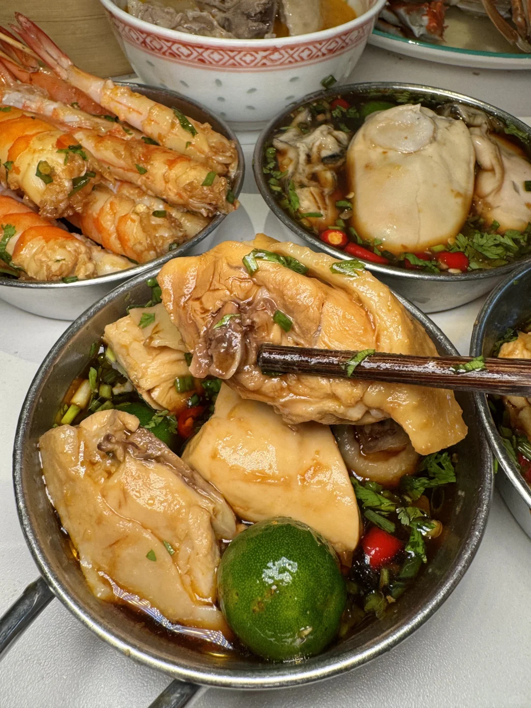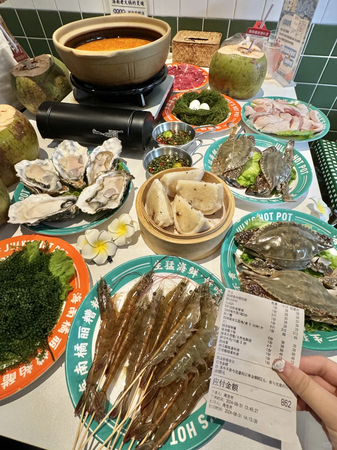 在南京能吃到糟粕醋火锅真的好幸福啊!店外装置充满了海南岛风情,清新的色调好适合拍照,让人仿佛在三亚度假⛱️ - 没涮海鲜之前我就喝了他家锅底,酸辣口的好开胃,我喜欢!先开涮海鲜,虾虾上桌还在活蹦乱跳,梭子蟹、鲍鱼、生蚝个头都很大,煮完后确实是地道的海南风味! - 然后加入鲜嫩的文昌鸡,一定要蘸着店内独家蘸料,小青橘提升了口感,超适合夏天~ 他家椰子饭、清补凉、炒冰都可冲!尊嘟梦回三亚…