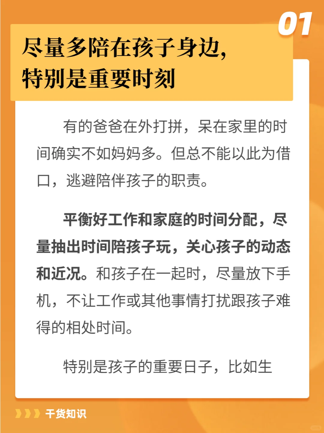 1️⃣尽量多陪在孩子身边,特别是重要时刻🕰️ 2️⃣主动介入孩子的教育,分担妈妈的压力📚 3️⃣追求上进,用榜样引导孩子变得更好更优秀🏆