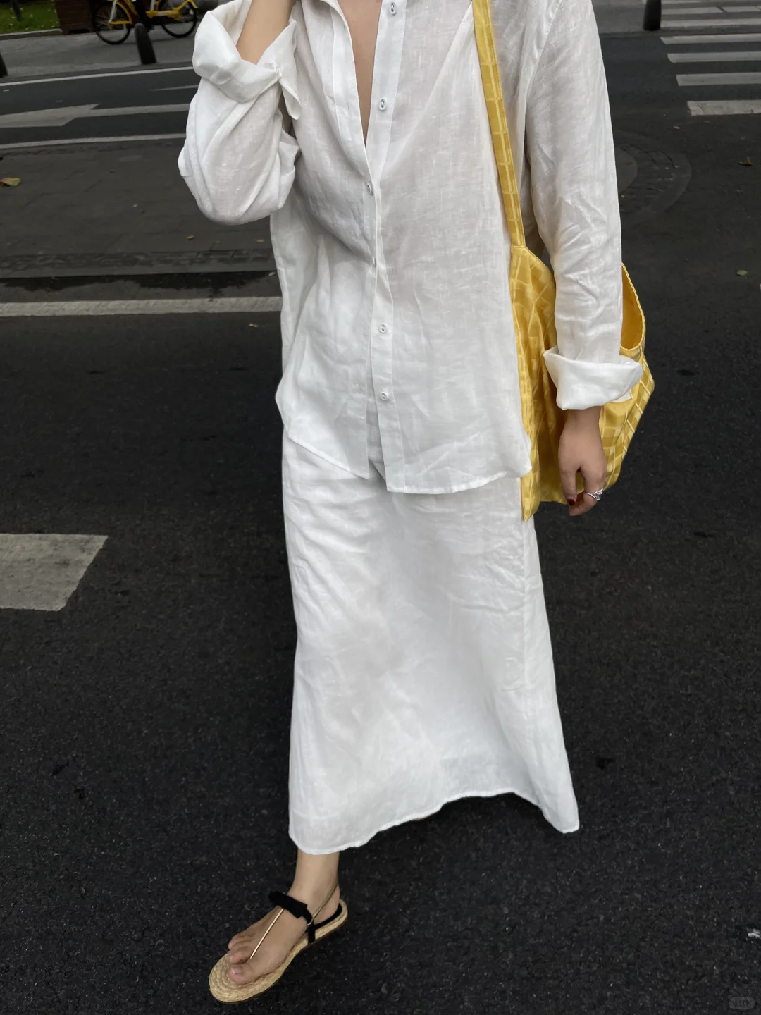 少女清新穿搭,黄色吊带裙搭配米色长裤,轻松惬意。