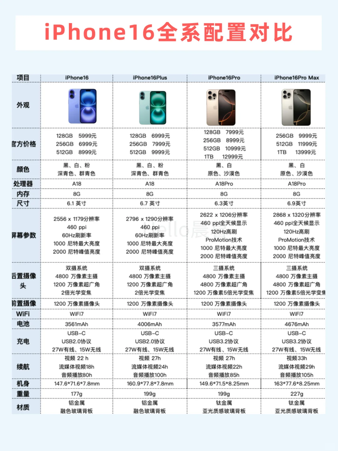 材质:16和16 Plus采用铝设计,融色玻璃背板;Pro系列采用钛设计、亚光玻璃质感背板。