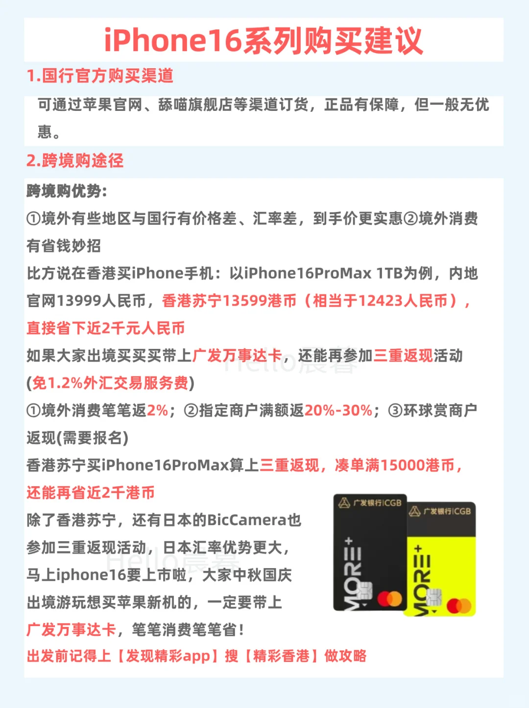 比如香港苏宁还有日本BicCamera购买苹果新机带上广发万事达卡,还能再参加三重返现活动(免1.2%外汇交易服务费)