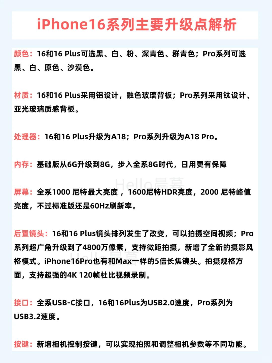 处理器:16系列升级为A18;Pro系列升级为A18 Pro。