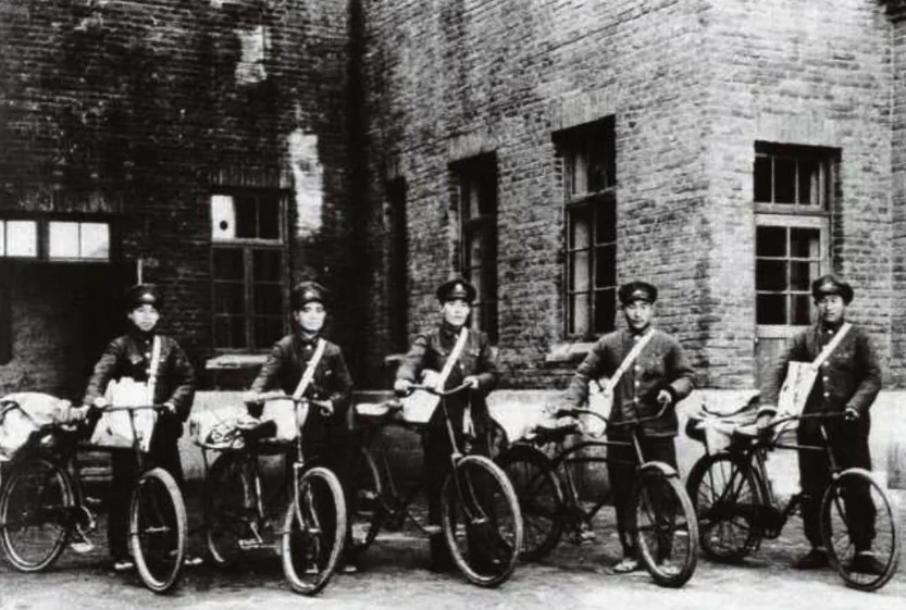 由于交通发展缓慢,在很长一段时间自行车成了邮差主要的交通工具,图为20世纪40年代江苏徐州的自行车邮班